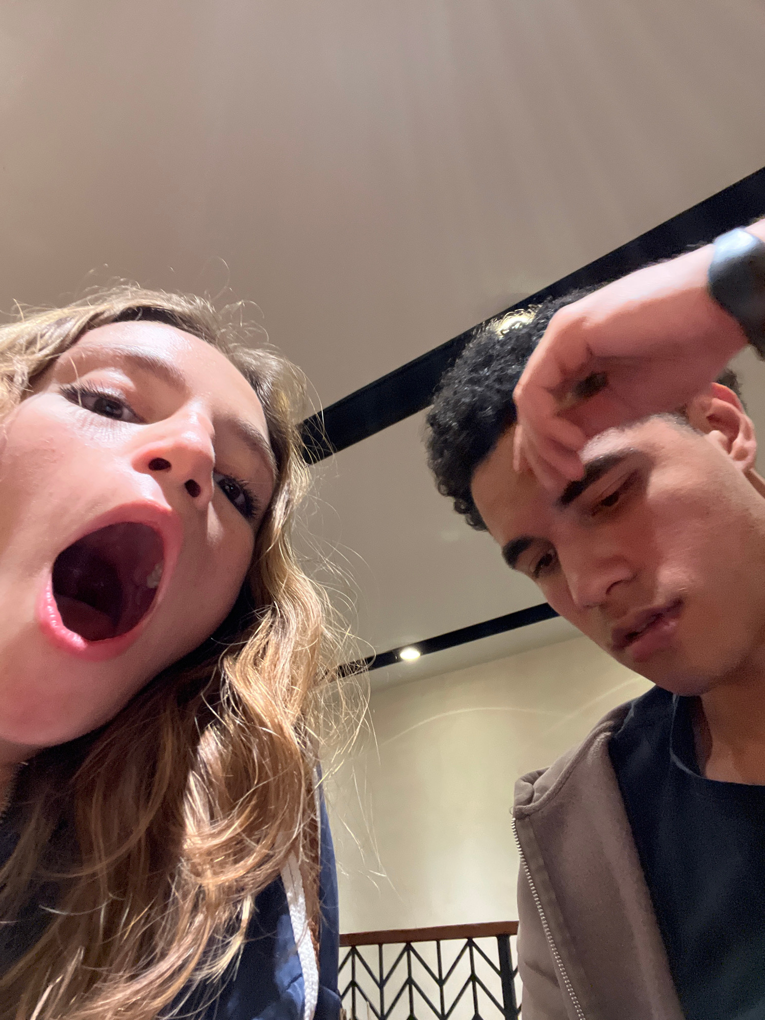 Two individuals are present in the image, which is taken from a low angle, looking upwards. The woman in the foreground has light brown hair and her mouth is open wide. The man behind has dark hair an…read more