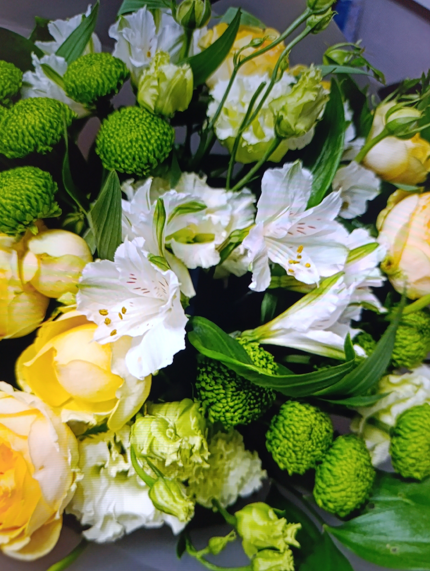 A close-up shot of a floral arrangement. It consists of white Alstroemeria flowers with small orange/yellow markings on their petals, yellow and white roses, and green chrysanthemum pompon flowers. So…read more