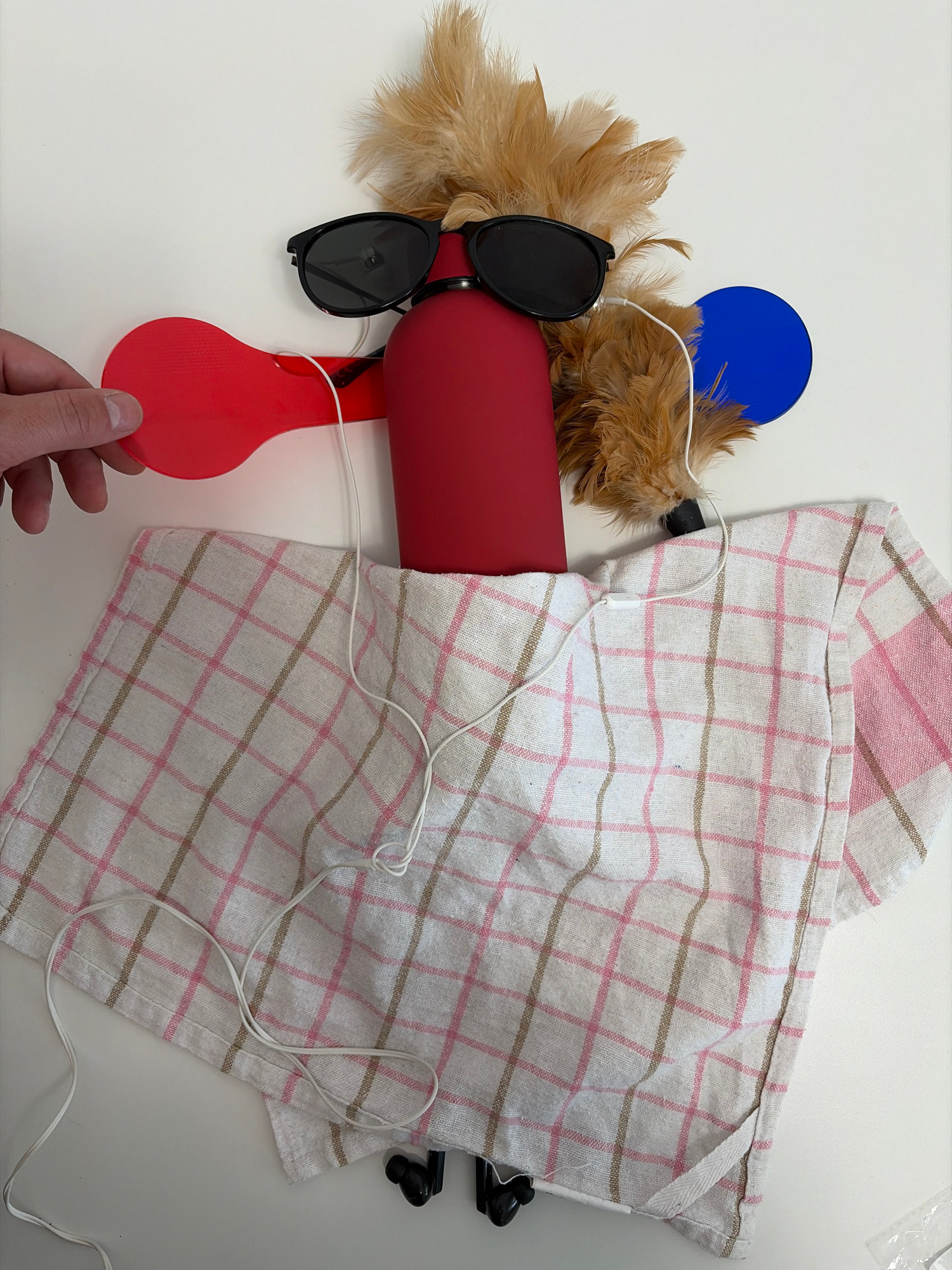 The image presents an artistic or whimsical arrangement of everyday objects on a clean, white surface, presumably indoors in Budva, Montenegro. Central to the composition is a red, cylindrical object,…read more