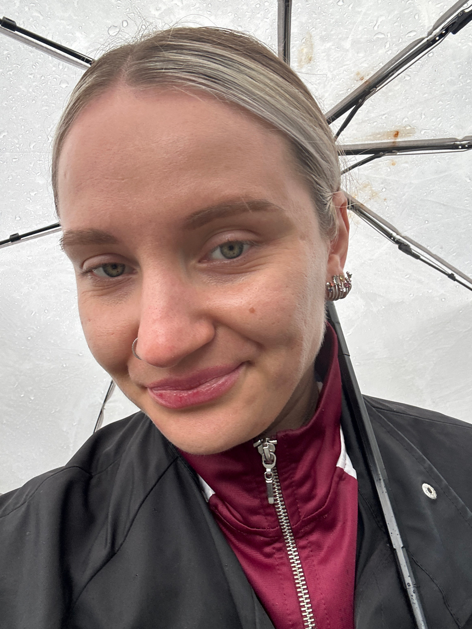 A close-up shot shows a person with fair skin, green eyes, and light blonde hair under a clear umbrella with water droplets. The person is wearing a burgundy jacket with a silver zipper underneath a bβ¦read more