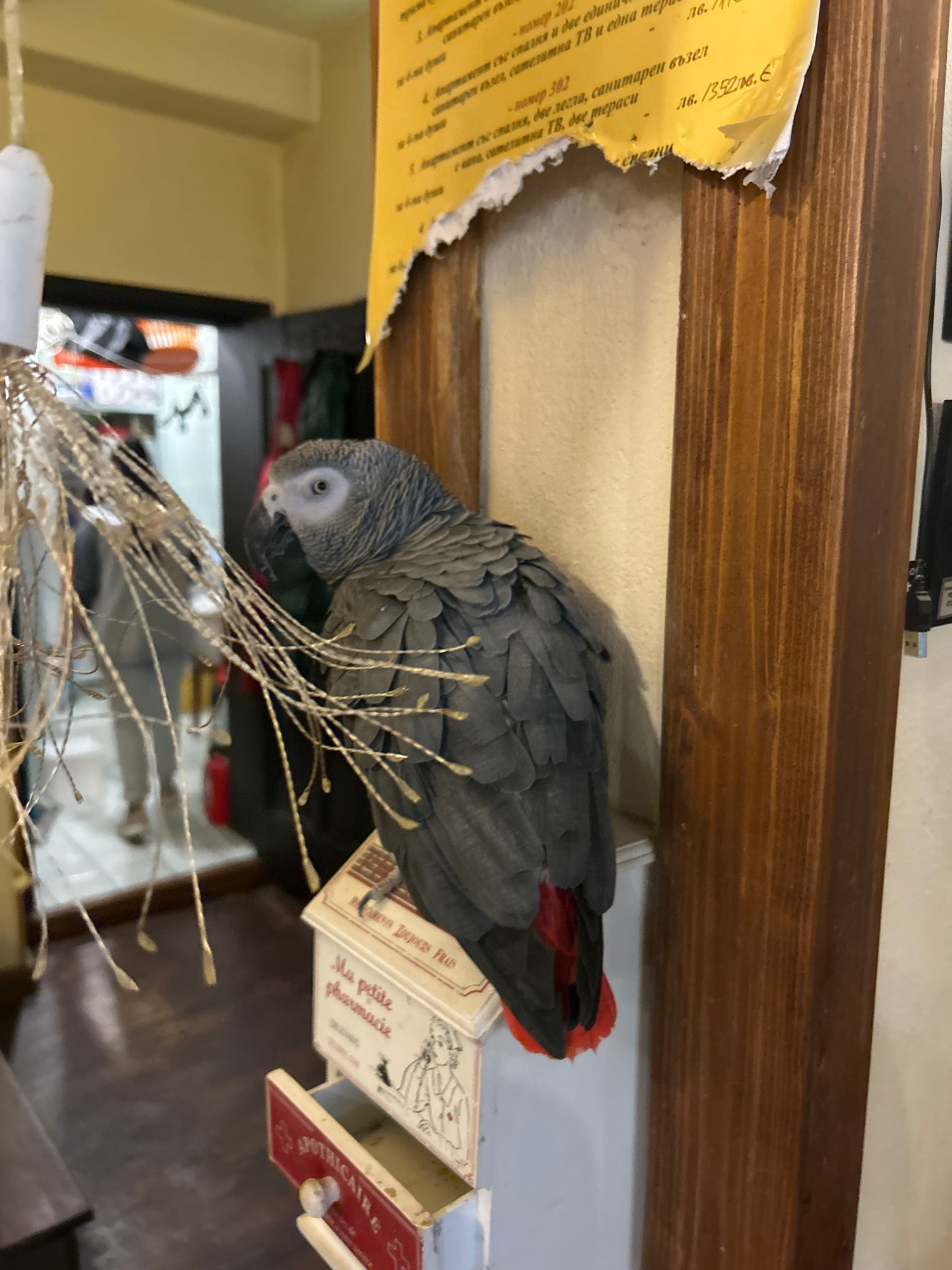A grey parrot with a red tail sits on a surface next to a small stack of decorated boxes. Behind the boxes are what appear to be decorative branches. A yellow sheet of paper with Cyrillic text is part…read more