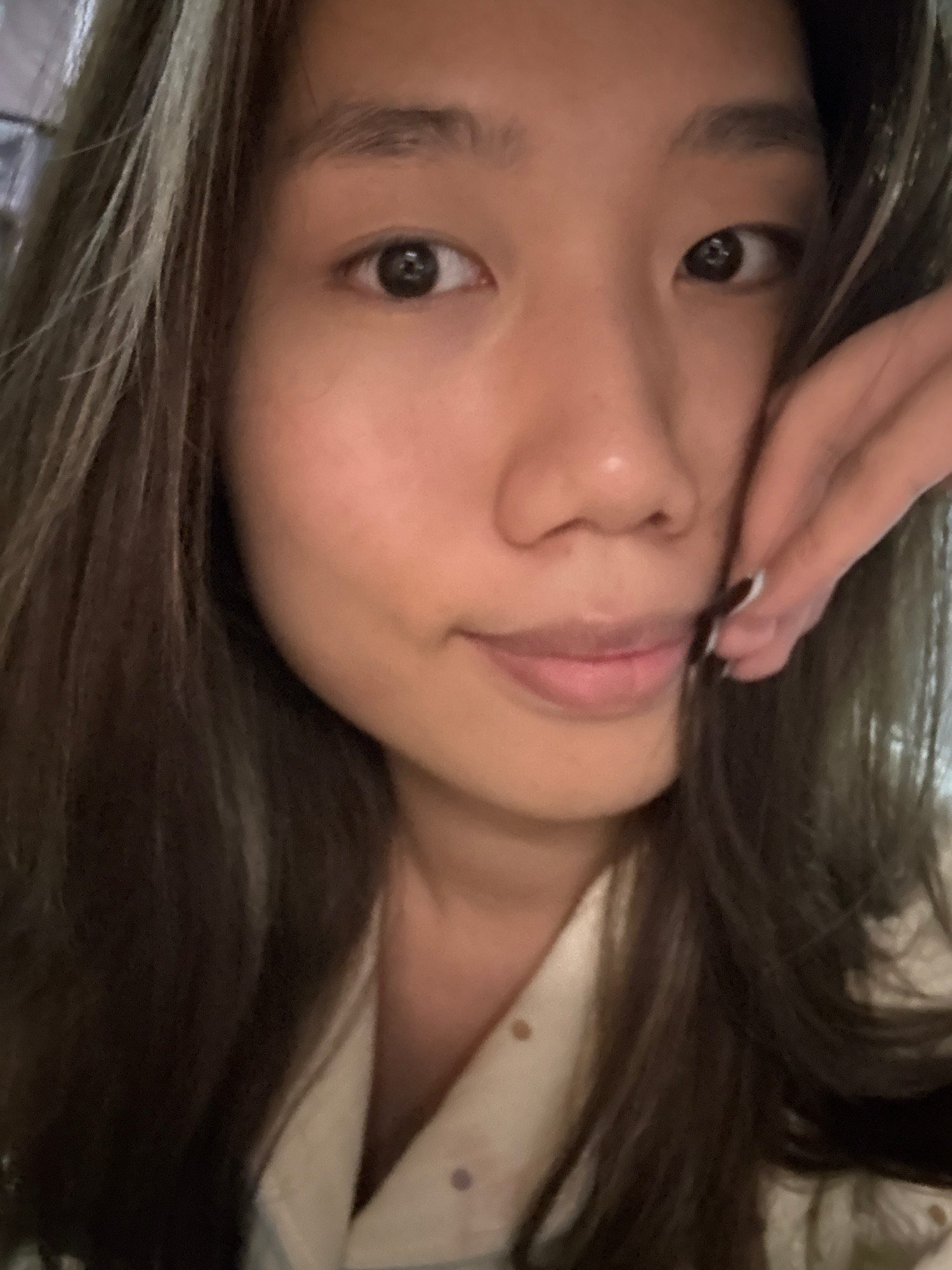 A close-up, low-angle shot of a woman's face, slightly tilted, with dark hair framing her face. Her skin tone appears light to medium. She has dark eyes and her lips are slightly parted. Her right han…read more