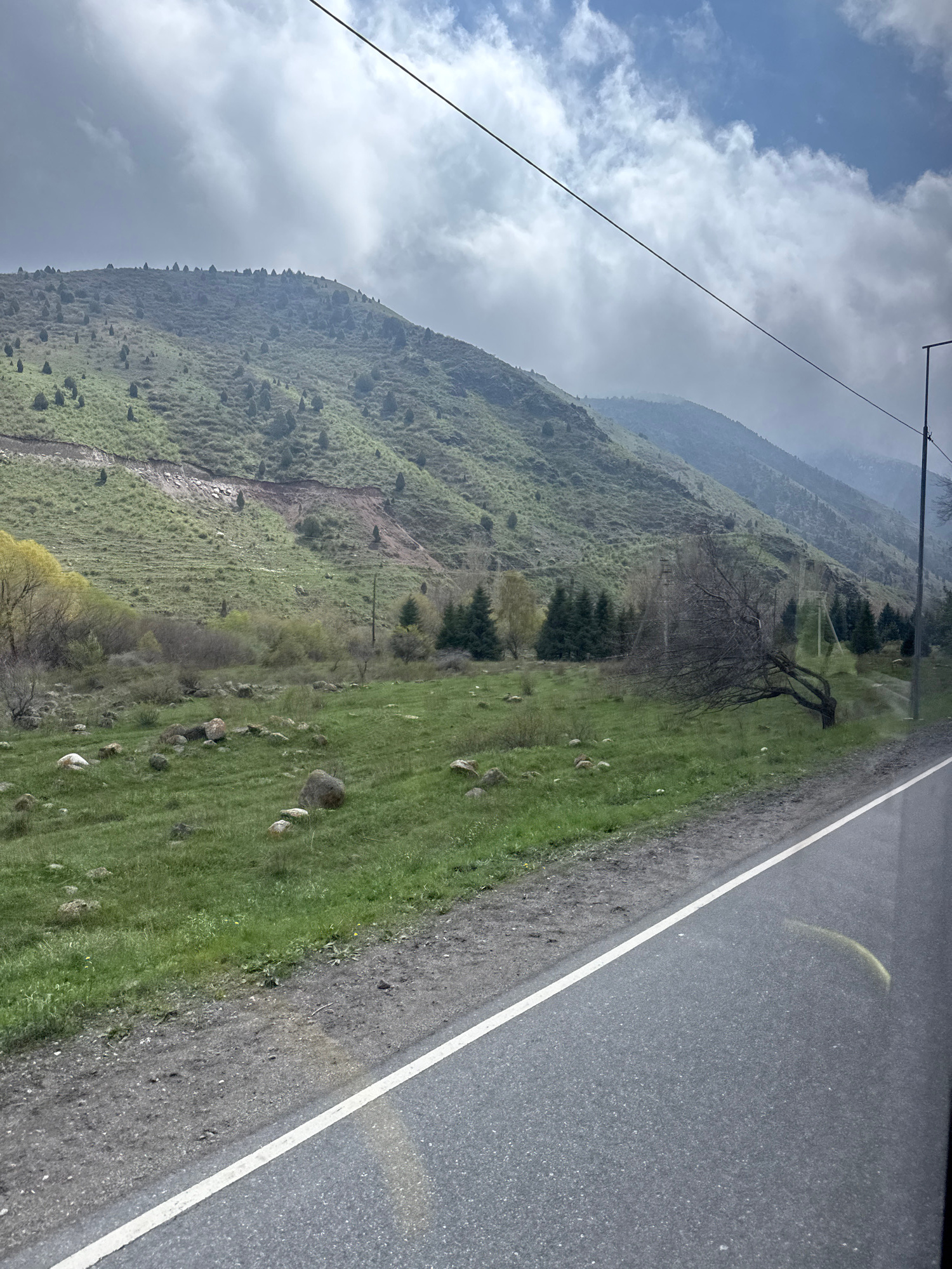 The image depicts a roadside scene in Kashka Suu, Kyrgyzstan, adjacent to a mountainous landscape. The road, marked with a white line, runs alongside a grassy embankment speckled with rocks. Beyond th…read more