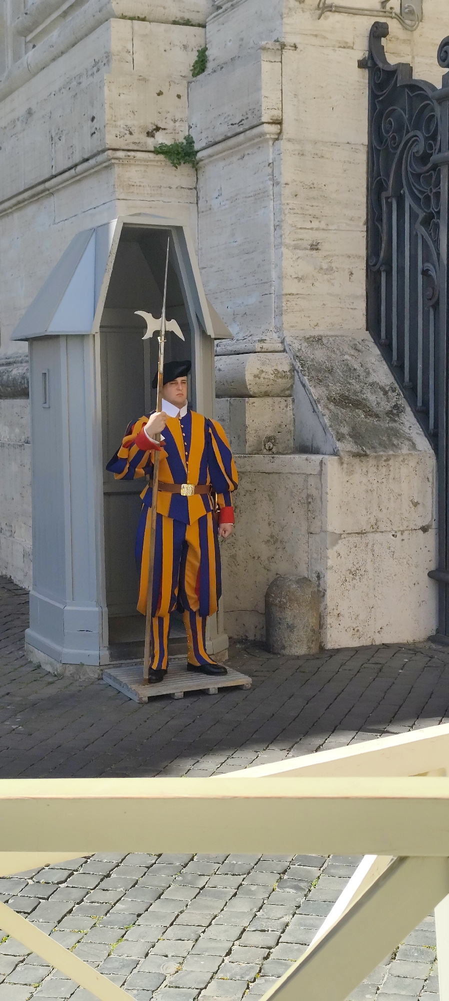 A full-length, eye-level shot shows a Swiss Guard standing in front of a grey guard house at the Vatican City in Città del Vaticano. The guard is dressed in traditional yellow and blue striped uniform…read more