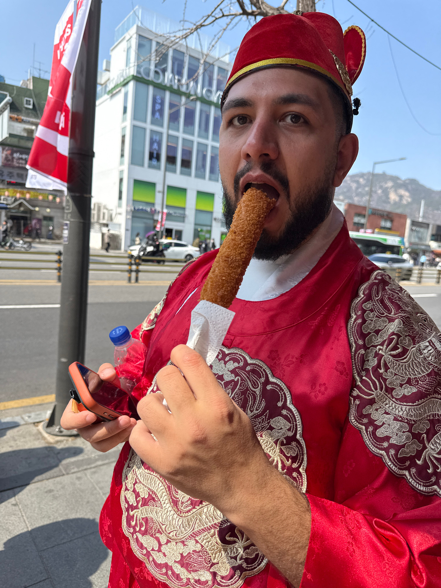 A male subject, with dark hair, a beard, and a mustache, is captured in a medium-shot on a sidewalk in Seoul, South Korea. He is wearing a traditional red Korean royal court attire, including an embro…read more