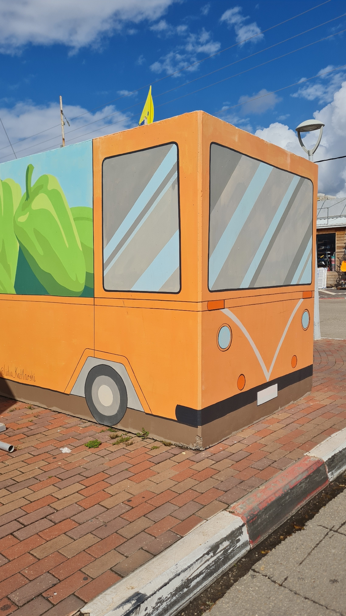 The image shows a painted, orange Volkswagen bus on a concrete block in Nahariyya, Israel. The bus has large, grey-tinted windows with blue and grey stripes. The top of the bus has orange headlights a…read more