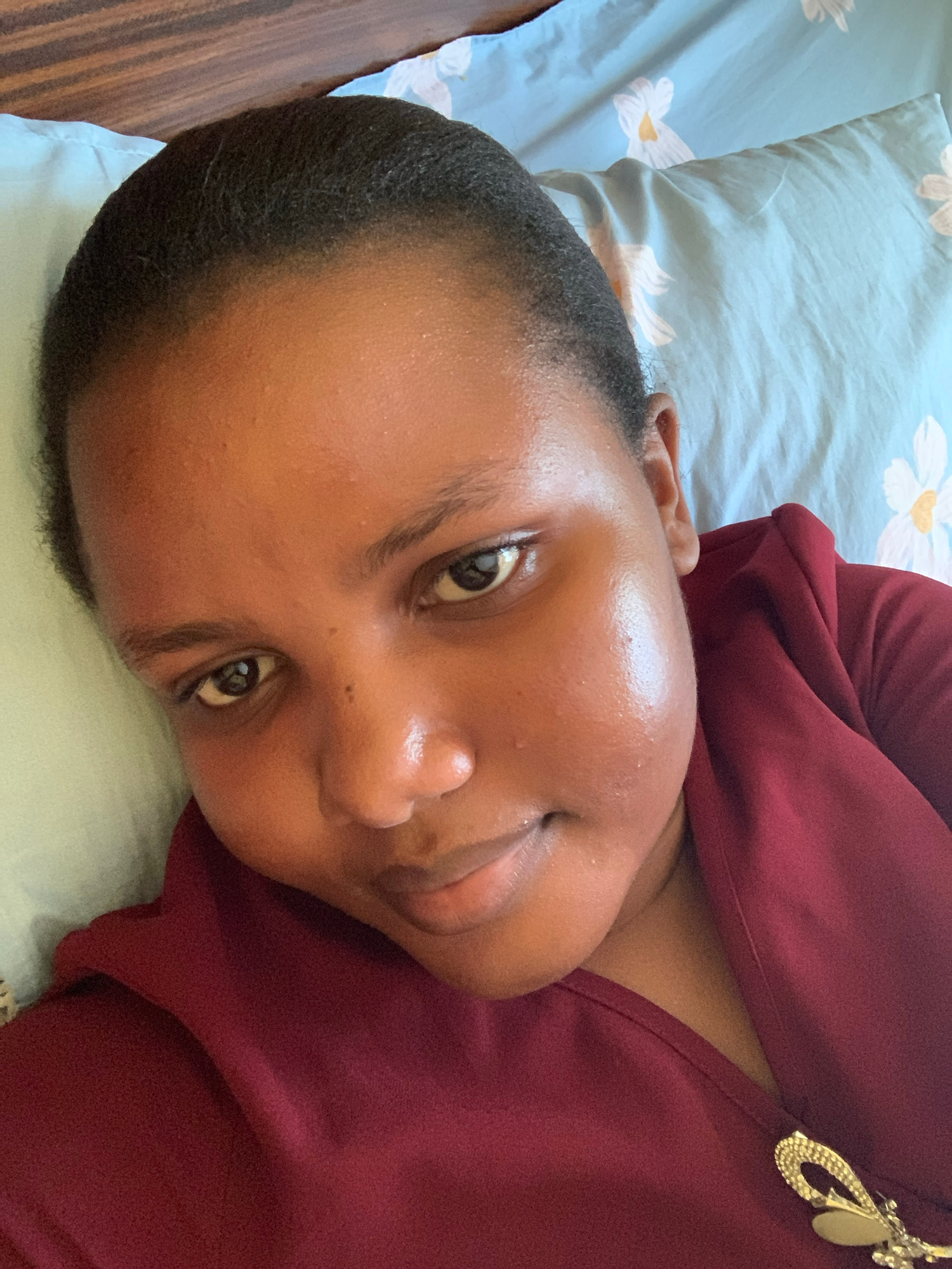 A person with dark skin and short, dark hair is lying on a light blue pillow patterned with white flowers. They are wearing a maroon-colored garment with a gold-colored brooch. The person is looking a…read more