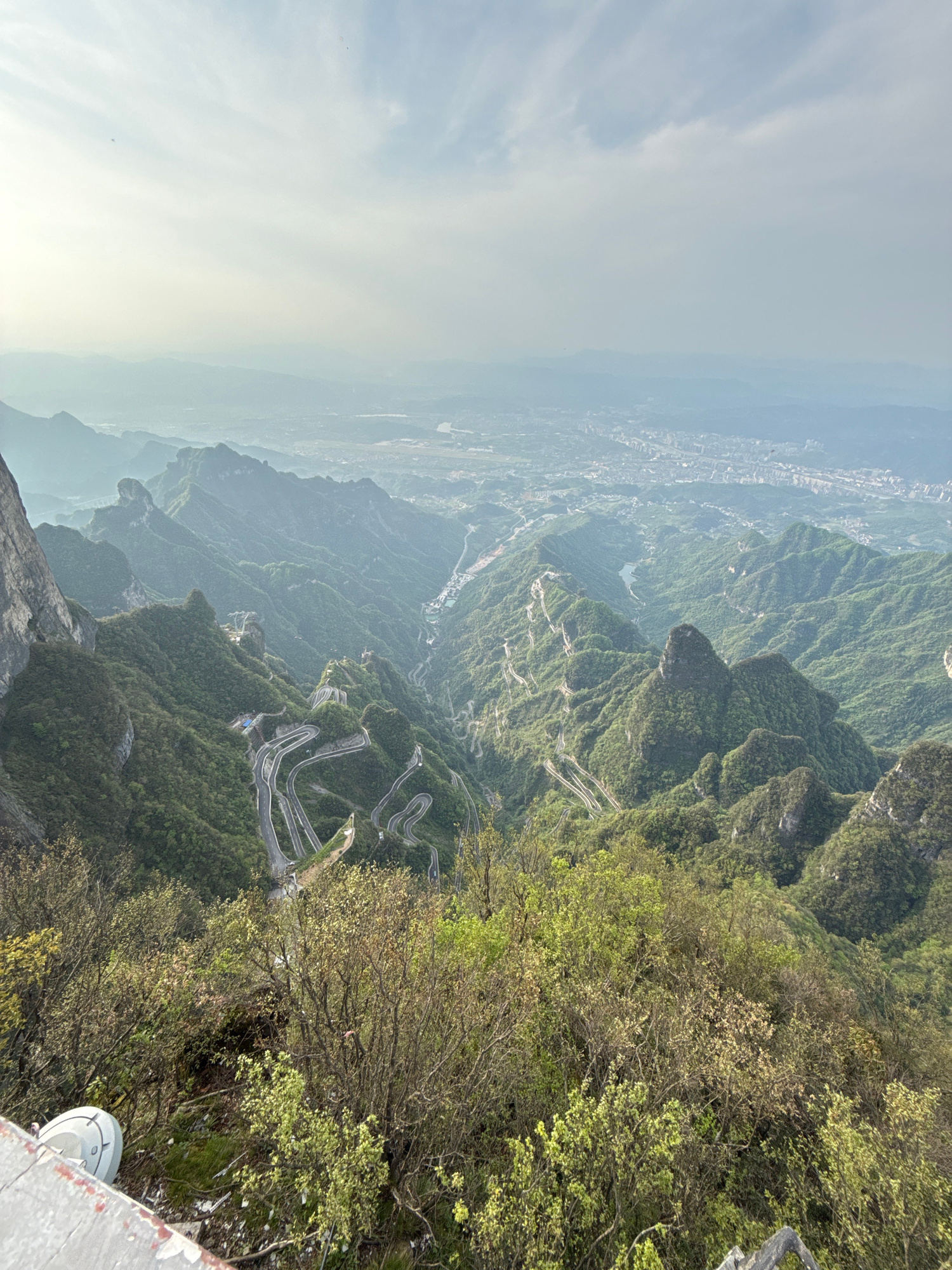 A high-angle view captures Tianmen Mountain Road, also known as the 99 turns road, descending through lush, green mountains in the Yongding District of China. The road is comprised of winding hairpin…read more