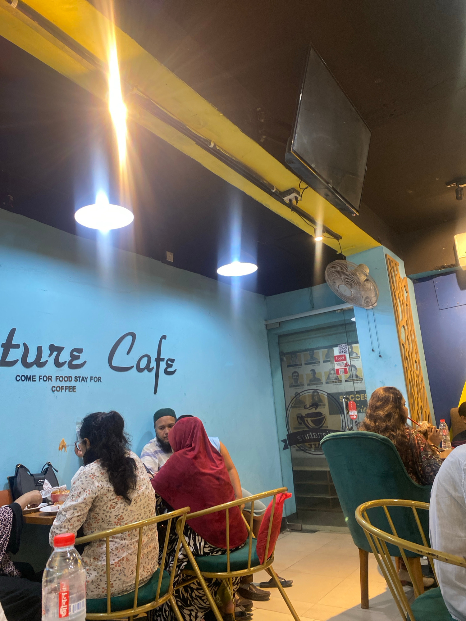 Here's a detailed description of the image: **Location:** The interior of a cafe identified as "Lure Cafe" in Dhaka, Bangladesh. **Environment:** The cafe has light blue walls with "Lure Cafe" writt…read more