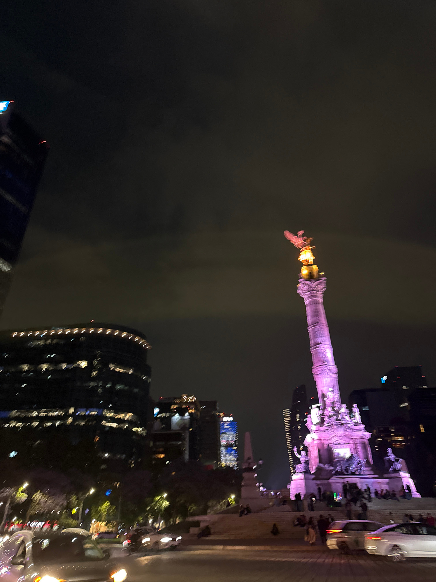 At night, the Angel of Independence monument glows brightly in the city of Mexico City, Mexico. The monument is a towering column topped with a golden angel, bathed in pink and purple light. Below the…read more