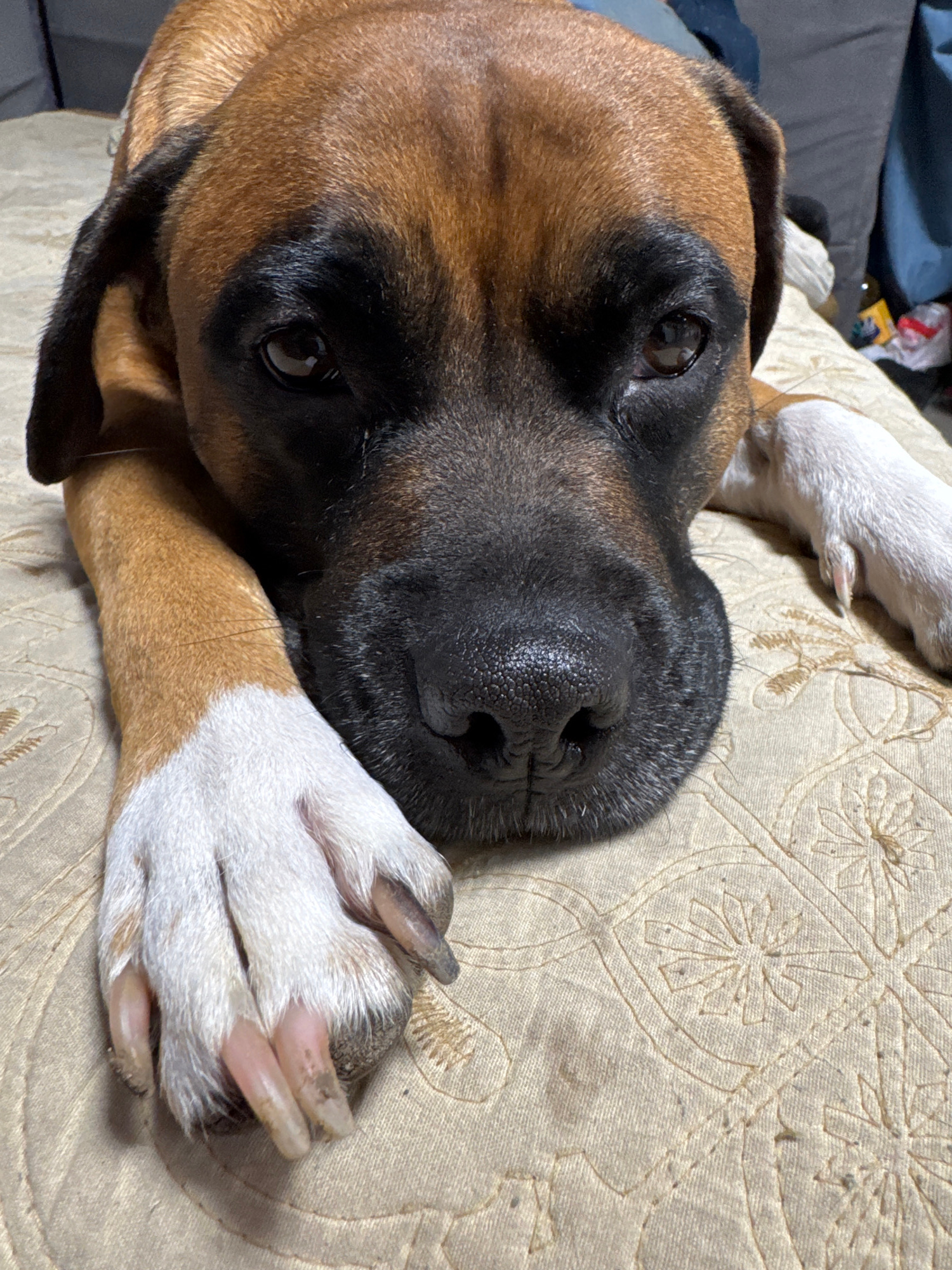 A close-up, high-angle shot depicts a brown and black Boxer dog lying on a tan patterned surface, likely a bed or couch. The dog's head is central, with its large, black nose prominently featured. Theβ¦read more