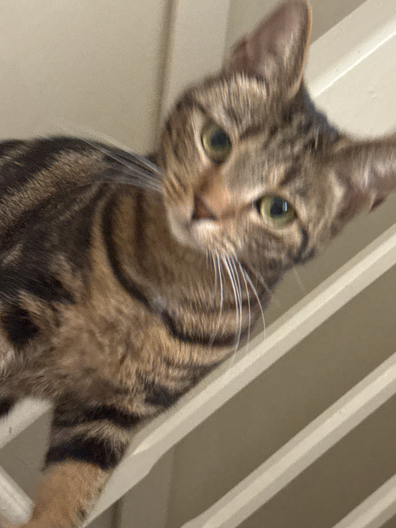 A close-up shot features a brown tabby cat with black stripes, green eyes, and white whiskers. The cat is looking downward, its head tilted to the left. The background consists of white, parallel barsβ¦read more