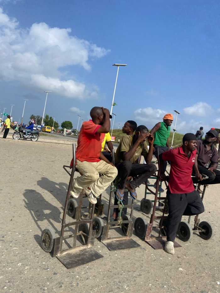 The image depicts an outdoor scene featuring several men seated on custom-built, metal-framed trolleys on what appears to be an asphalt or concrete road. There are at least six adult males visible in…read more