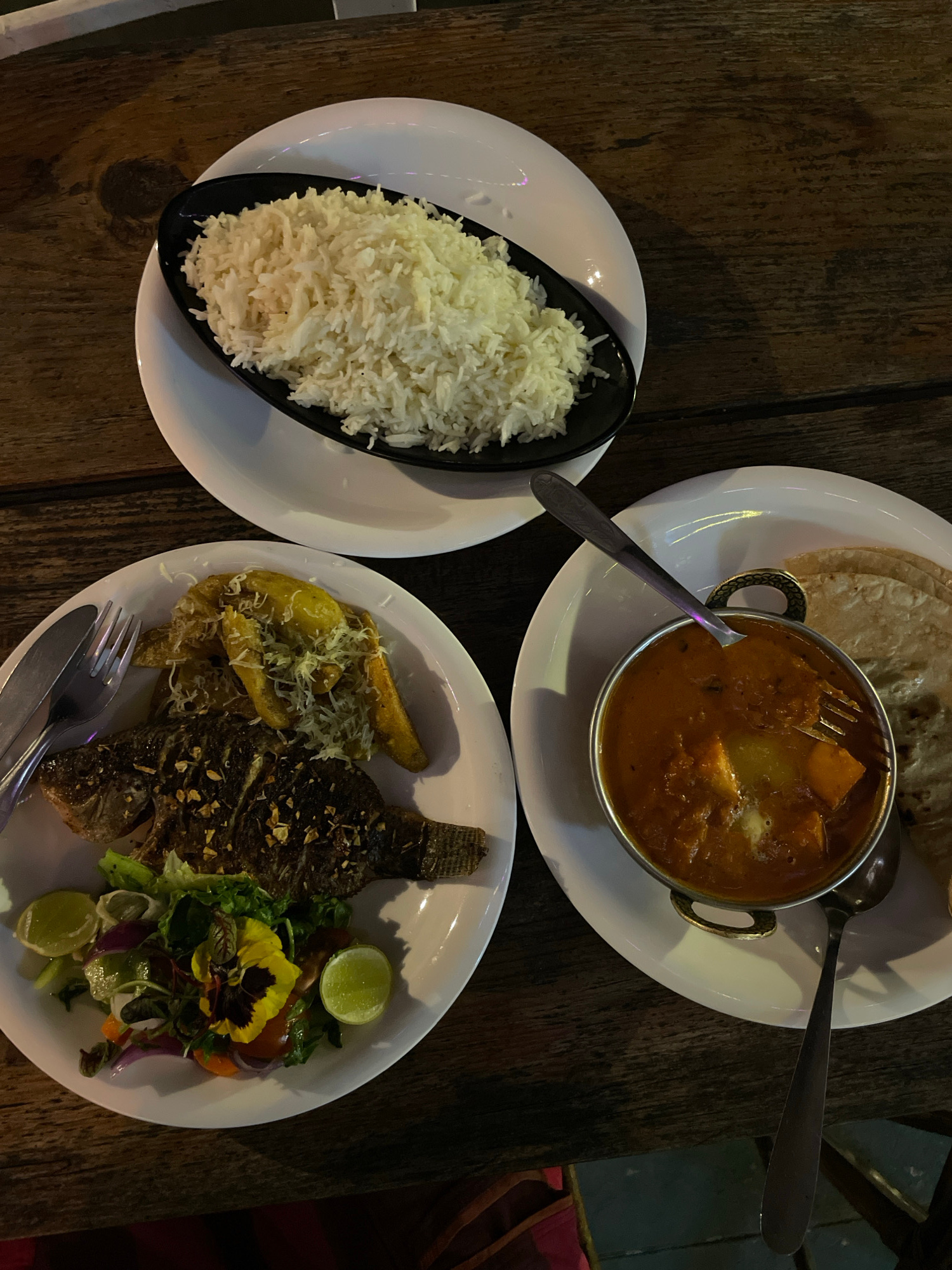 The image shows a table with three plates of food. One plate contains what appears to be a curry in a metal serving dish along with a folded flatbread. A fork is inserted into the curry, and a serving…read more
