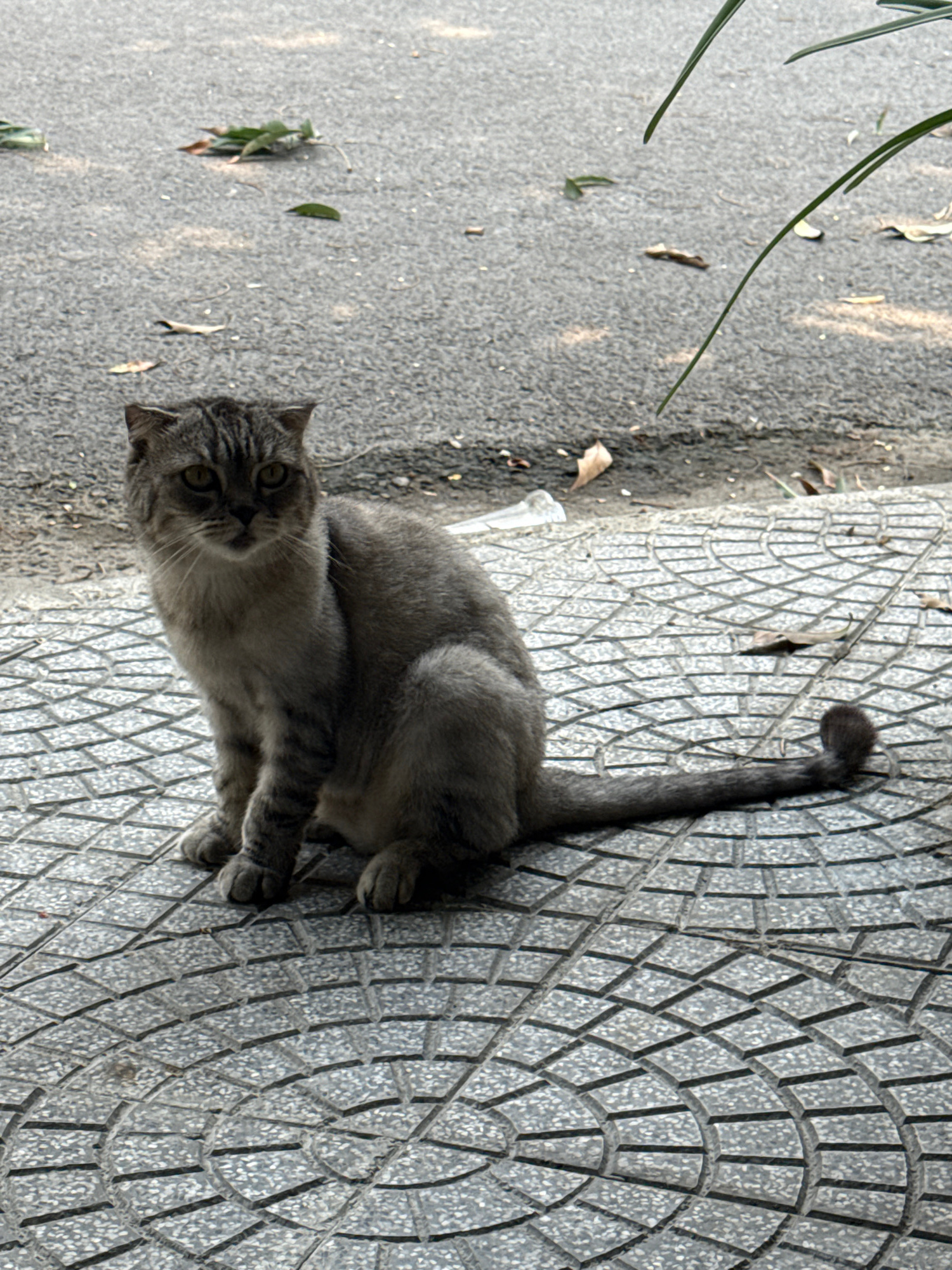 A medium-sized gray tabby cat with green eyes is the main subject of the photograph. The cat is crouching on a gray, patterned tile sidewalk. The cat is facing the camera. To the left of the sidewalk…read more