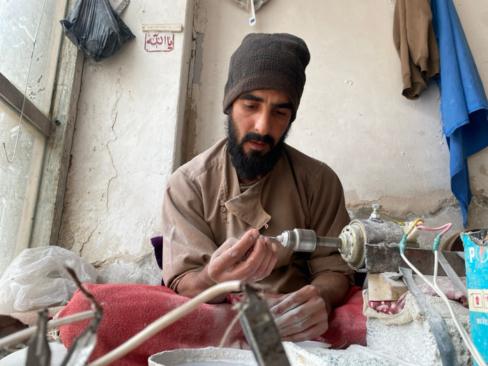 Within a modest workshop located in Kandahar, Afghanistan, a male artisan with a dark beard, mustache, and wearing a dark beanie and light brown tunic, is depicted from the chest up, intently focused…read more