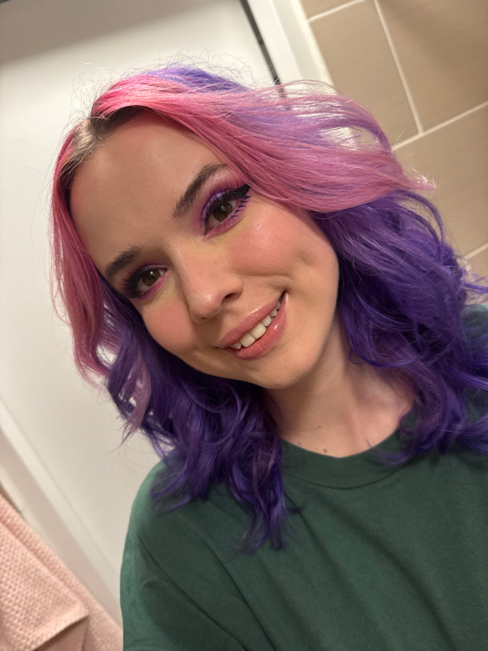 A female individual is depicted in a close-up, frontal portrait. She has wavy hair, split-dyed with pink on the viewer's left side and purple on the viewer's right side. Her eyes are made up with pink…read more