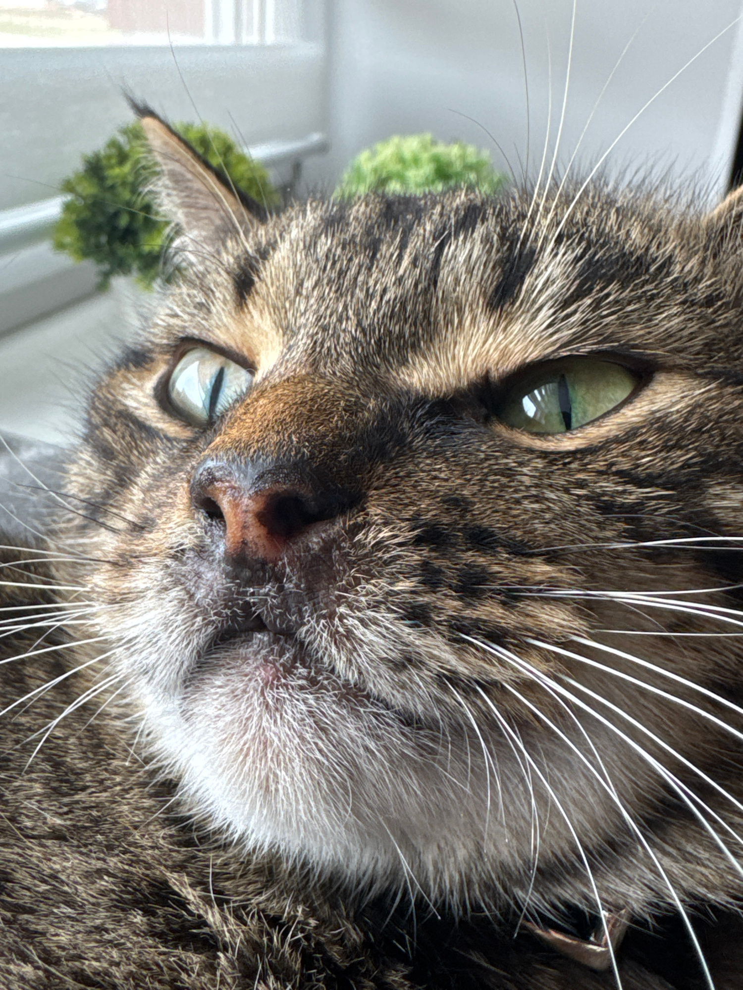 A close-up, rotated image shows a tabby cat's face. The cat has green eyes, a pink nose, and long white whiskers. The cat's fur is a mix of brown and black stripes. A green object is visible in the ba…read more