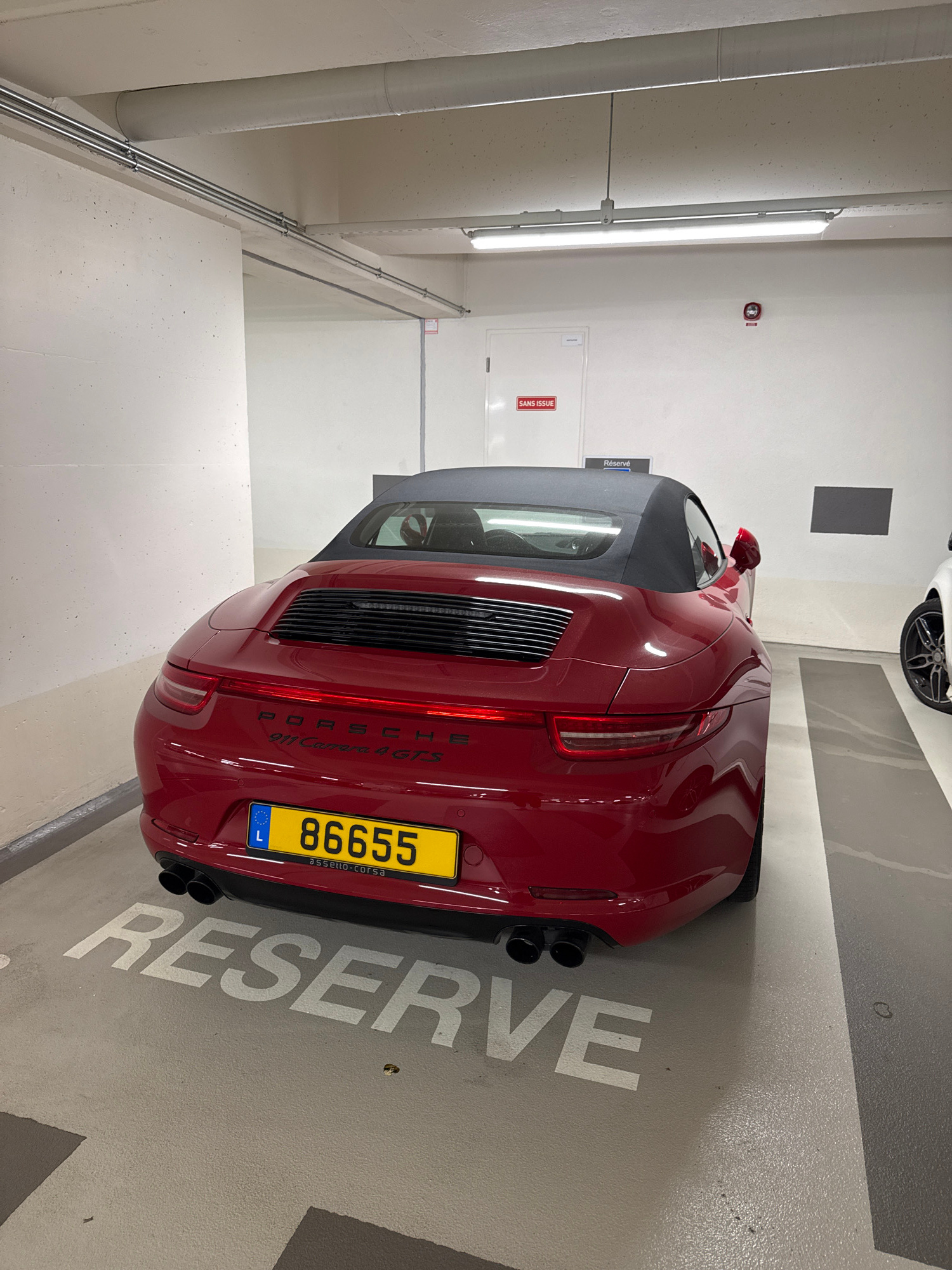 A red Porsche 911 Carrera 4 GTS convertible is parked in a reserved parking space inside an indoor parking garage. The car's Luxembourg license plate reads "86655" and "assetto corsa" is visible under…read more
