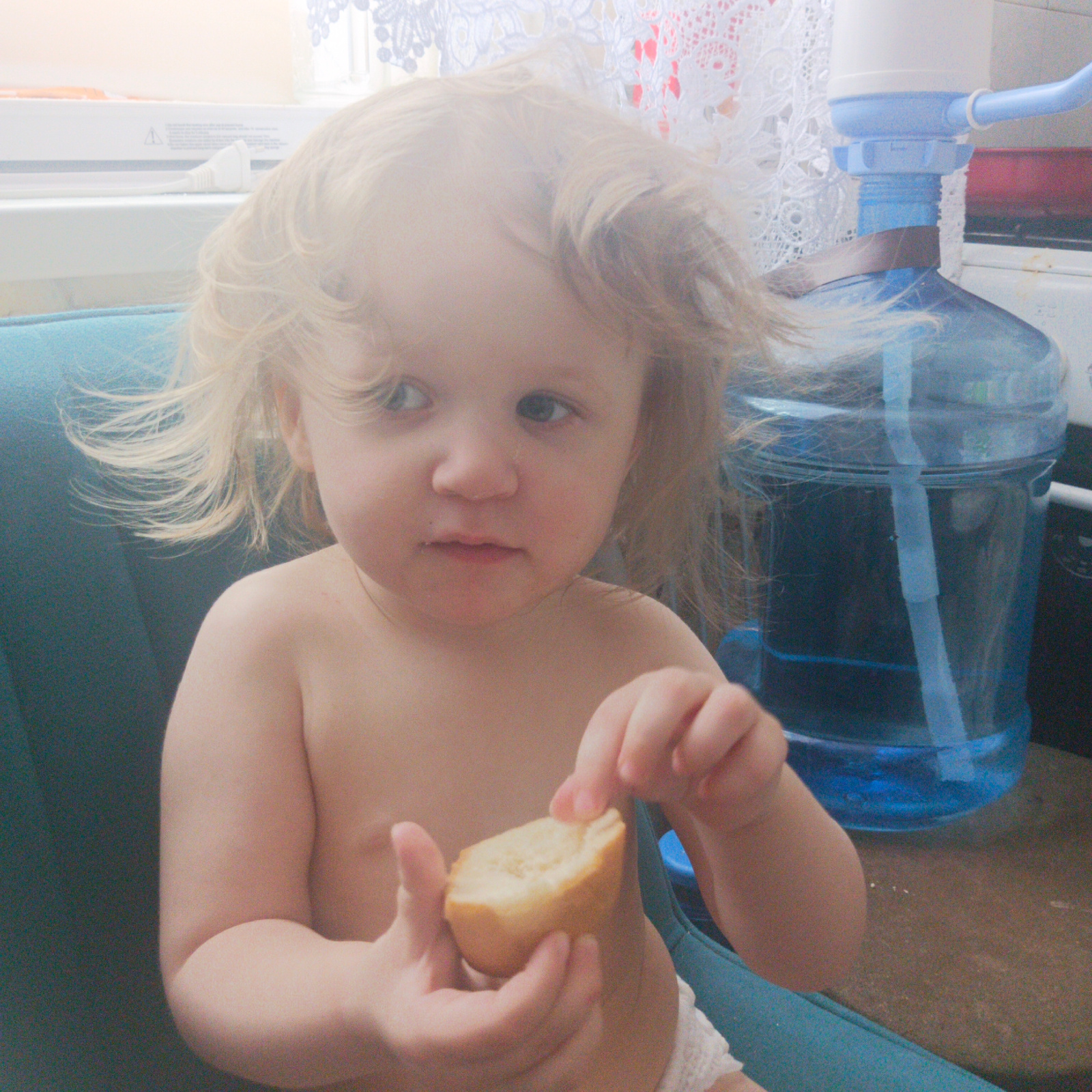 A young child with blonde, windblown hair sits in a blue upholstered chair. The child is holding a piece of bread in their hands. A large blue water bottle with a white pump mechanism sits on a surfac…read more