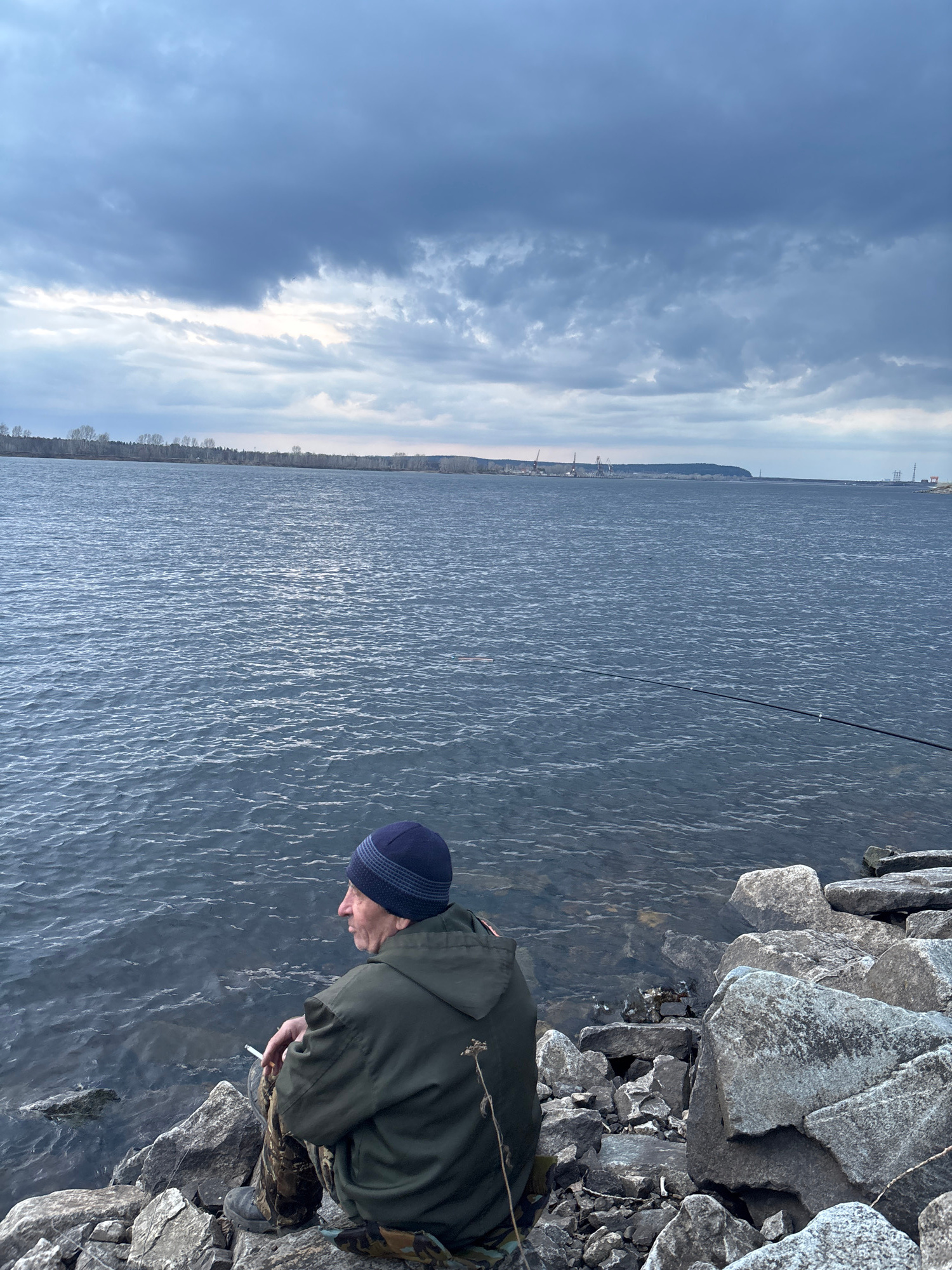 The image, taken in Chaikovsky, Russia, shows a man crouched on a rocky bank next to a large body of water, likely the Kama River or Votkinsk Reservoir. The man is wearing a dark blue beanie with a li…read more