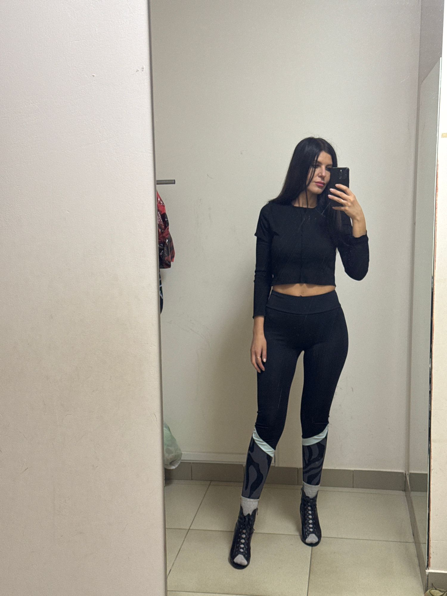 A woman is taking a selfie in a mirror. She has long black hair and is wearing a black long-sleeved crop top, black leggings with grey and black patterns on the lower legs, and black shoes with a lattβ¦read more