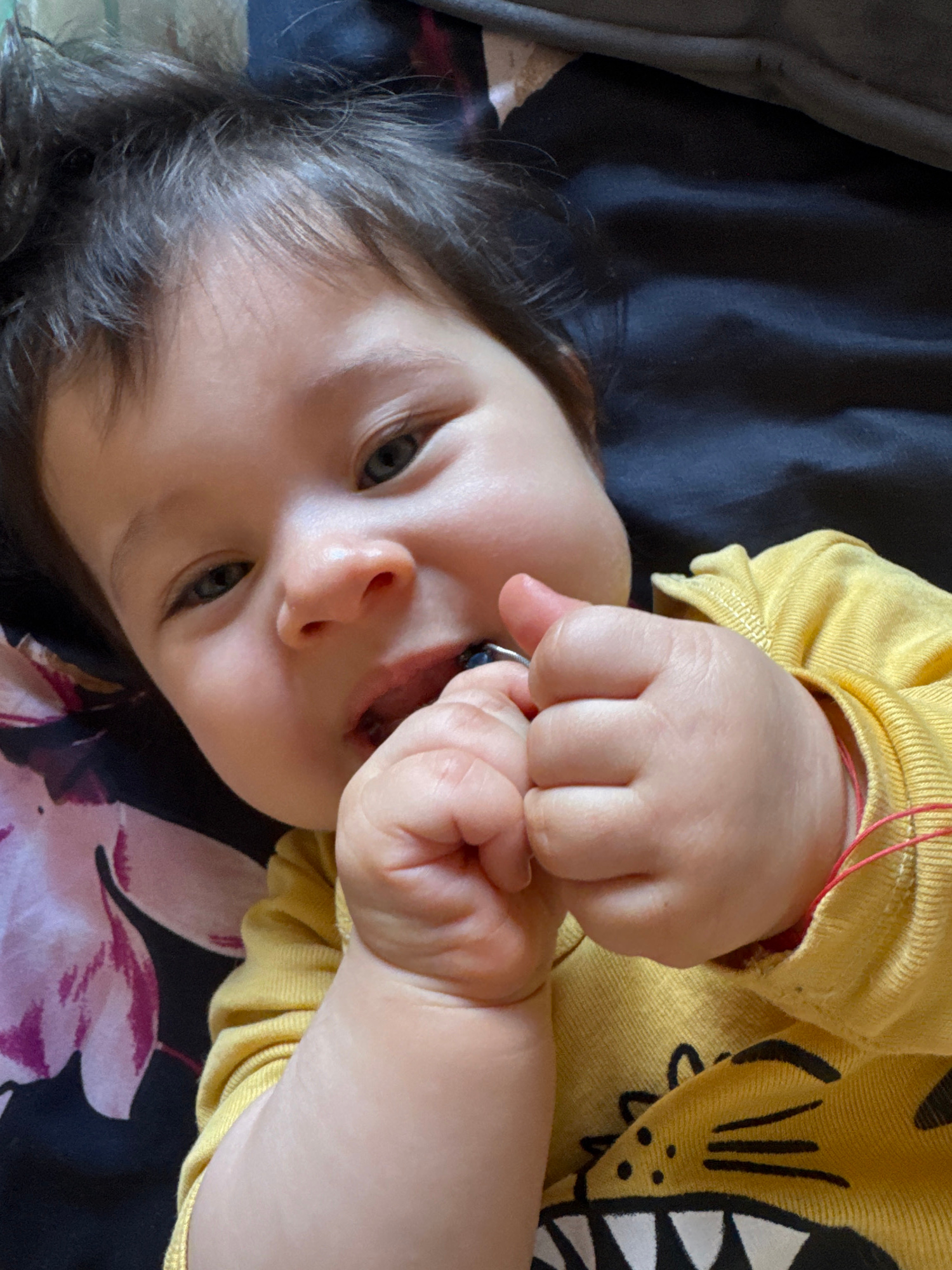 A baby lies on their back on a black floral patterned surface, with a grey cushion in the upper left corner. The baby is wearing a yellow long-sleeved shirt with a dinosaur design. The baby's hands arβ¦read more