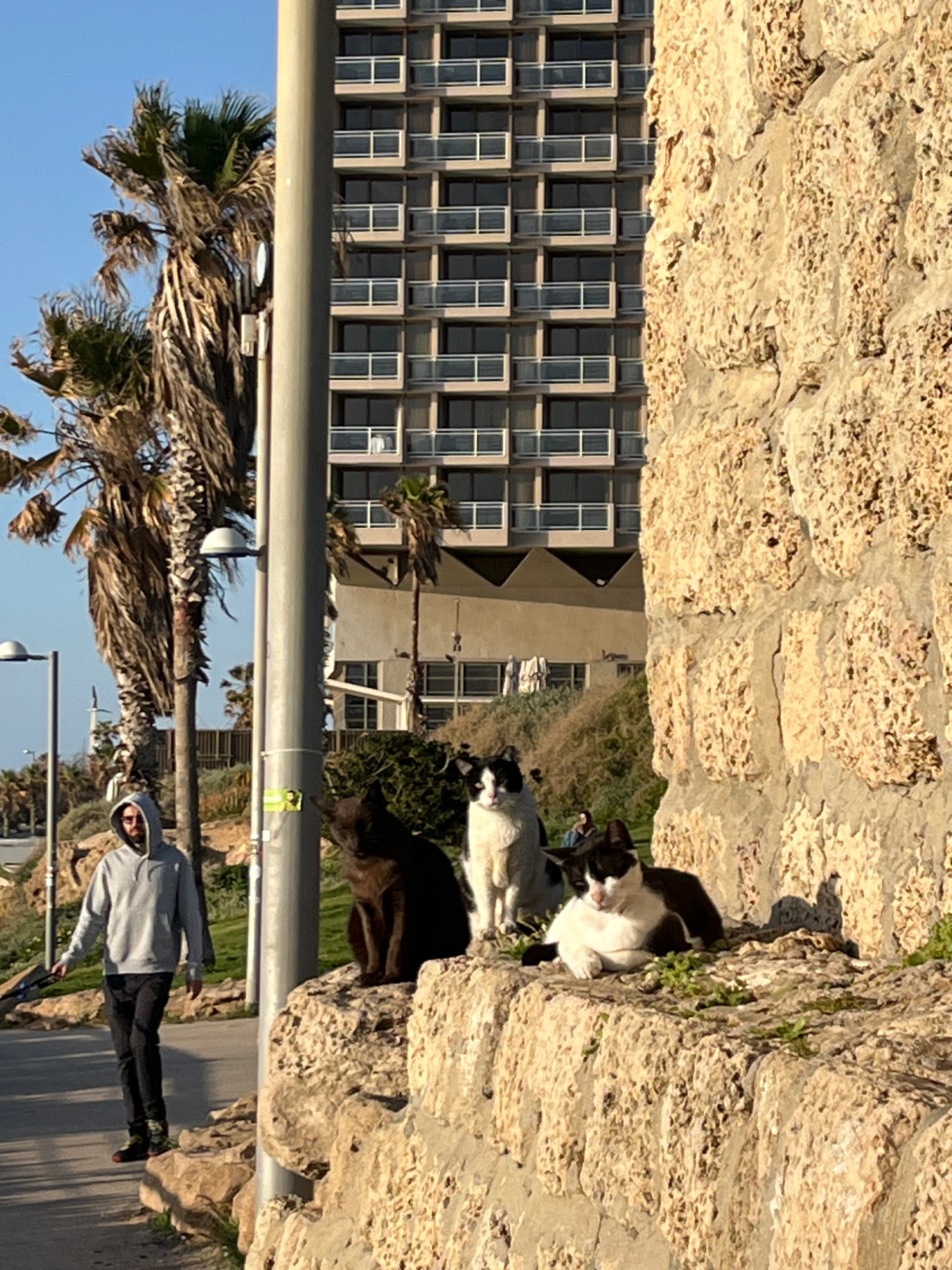 The image depicts a street scene in Tel Aviv, Israel, with a man walking along a road, a row of palm trees, and a building with numerous windows. Three cats are perched on a stone wall. The building a…read more