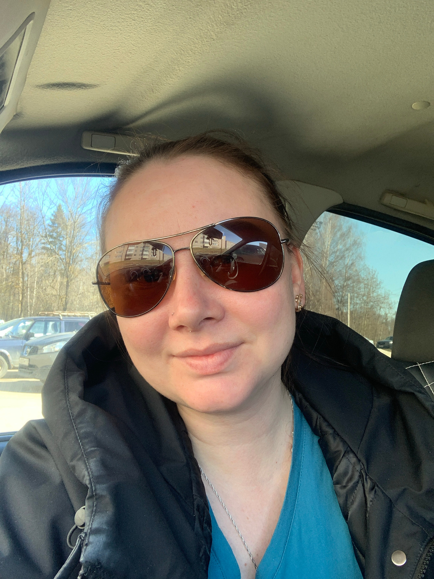 A selfie taken inside a car. The subject is wearing sunglasses, a blue top, and a black jacket. The car's interior is light gray. Through the window, bare trees are visible under a blue sky, with buil…read more