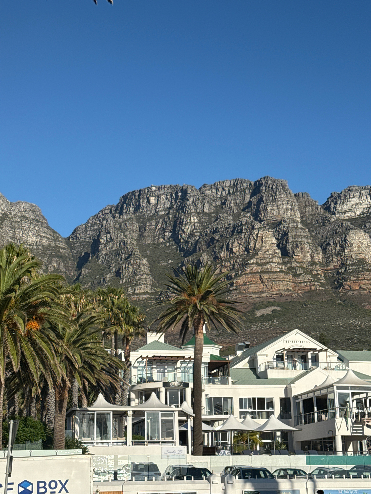 The image displays a clear daytime scene in Camps Bay, Cape Town, South Africa. A vast, rugged mountain range, consistent with the Twelve Apostles, dominates the background under a vivid blue sky. Theβ¦read more