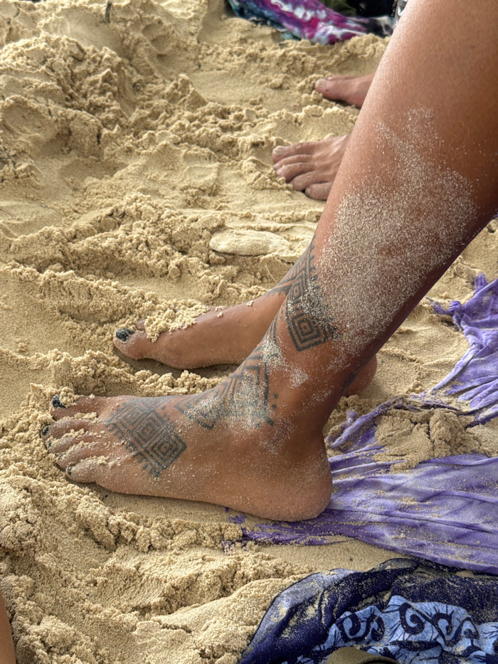 The scene depicts a sandy beach environment in Baan Sri Thanu, Thailand. The primary subject is the lower right leg and foot of an individual, resting on and partially covered by light brown sand. Theβ¦read more