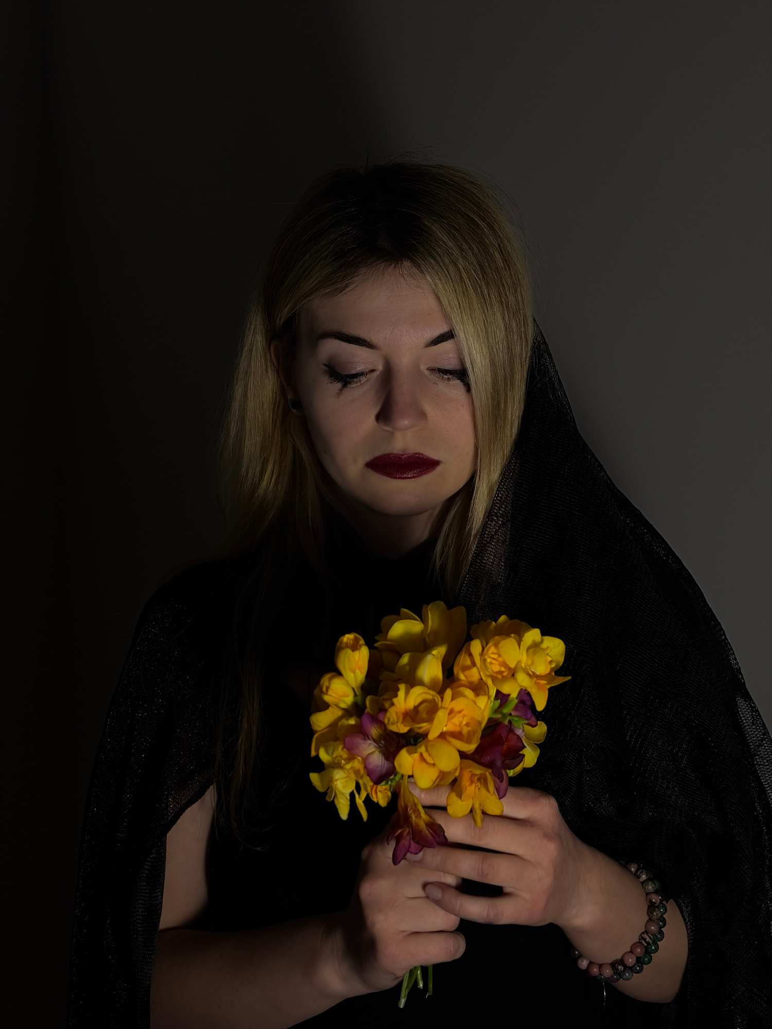 A medium-shot image shows a woman with blonde hair, dressed in black, with her eyes closed. She holds a bouquet of yellow and purple flowers in her hands, which are adorned with a beaded bracelet. The…read more