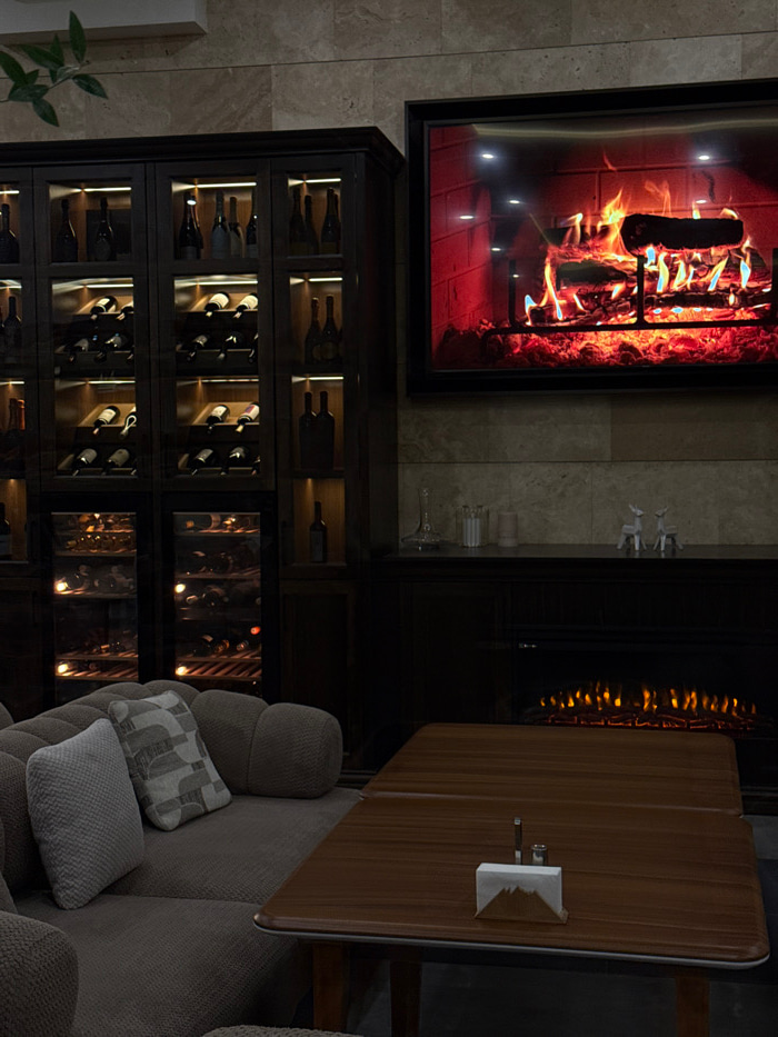 The image captures an indoor scene, likely a living or lounge area, with a warm and inviting ambiance, suggesting evening or nighttime. The primary elements are a large television displaying a firepla…read more