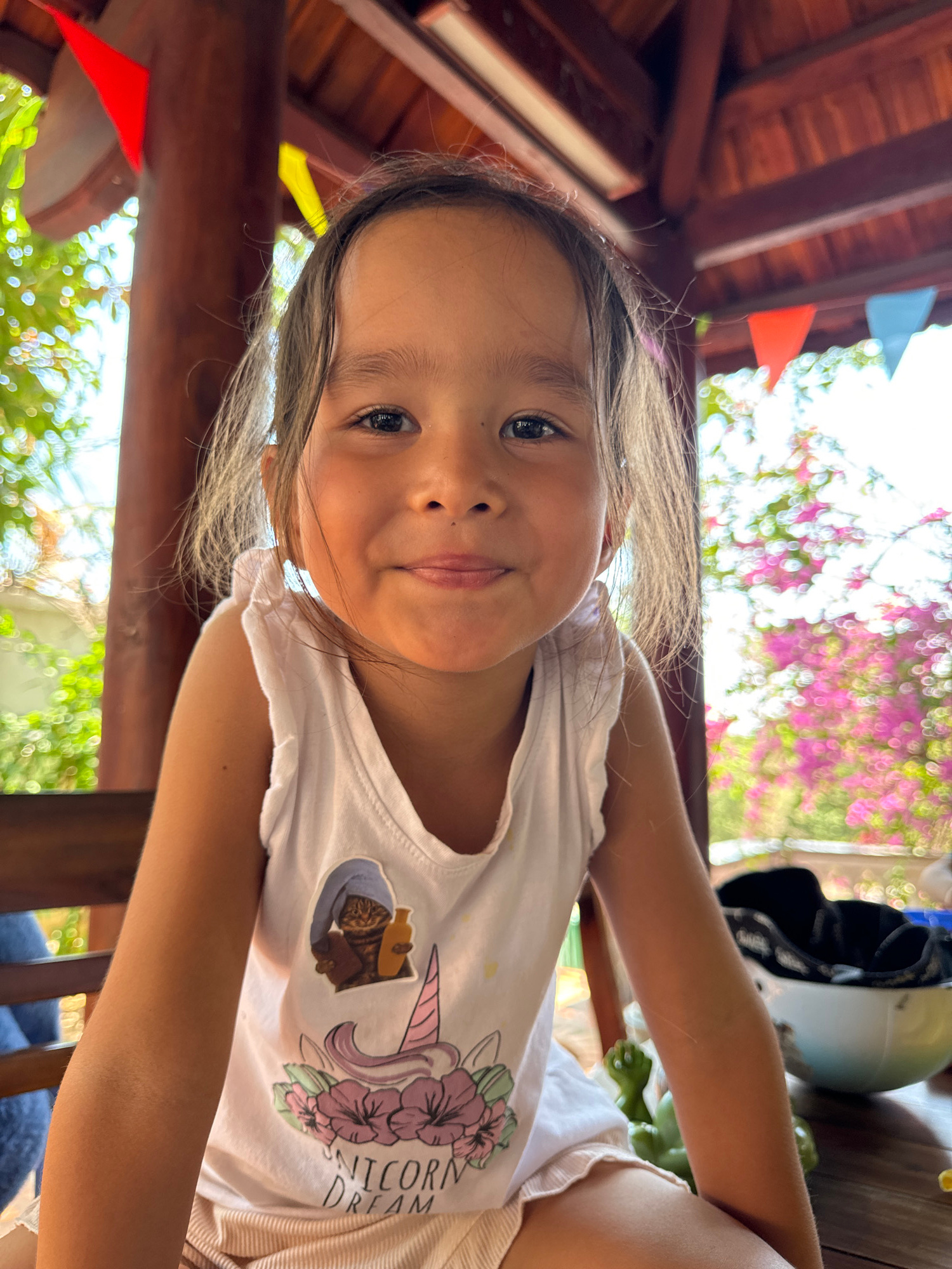 A young girl is depicted in an eye-level close-up, looking directly at the camera with a slight, gentle smile. Her head is tilted, suggesting she is positioned below the camera, perhaps lying down or…read more