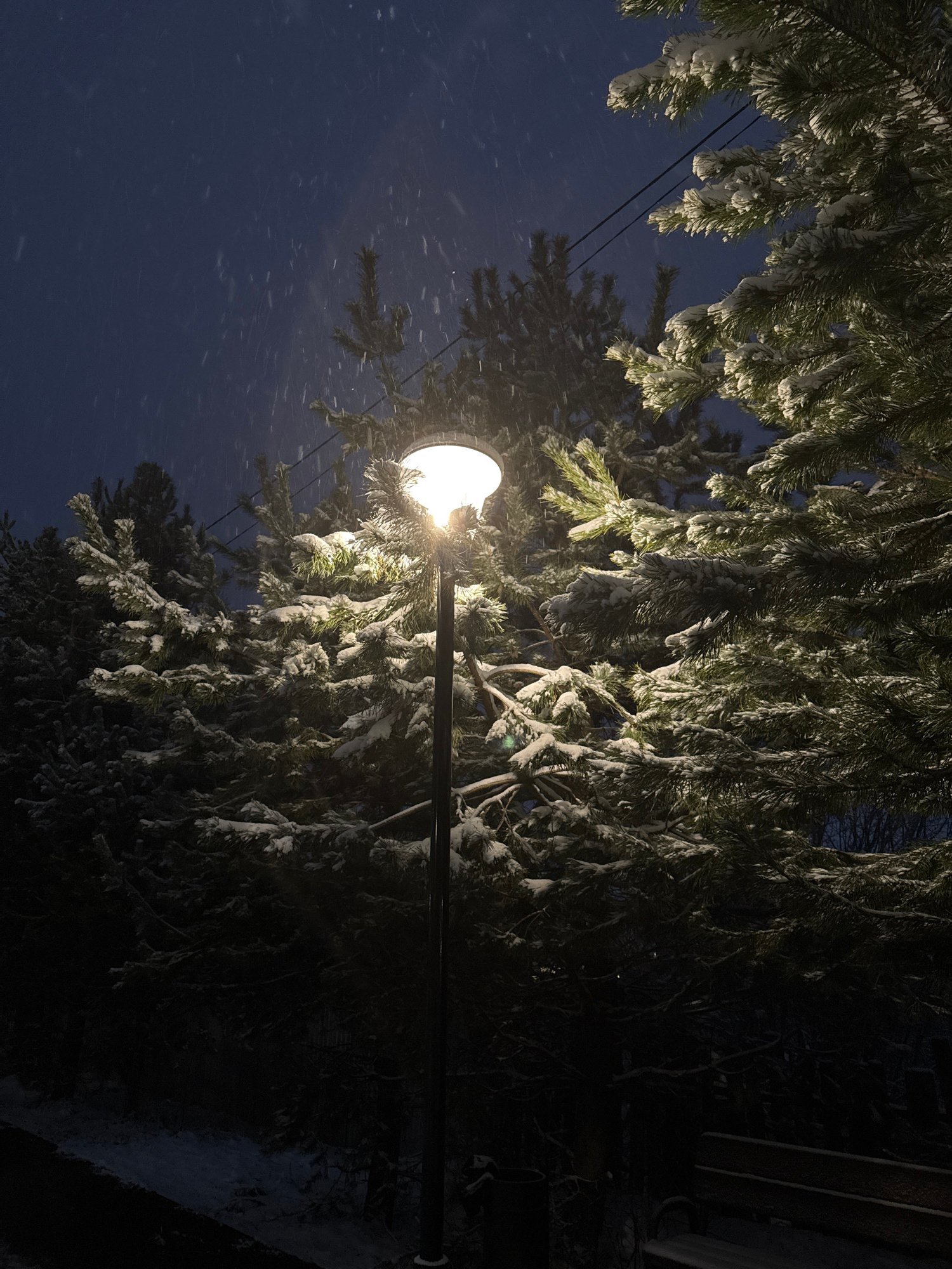 The image depicts a snow-covered tree illuminated by a streetlight at night. The branches of the tree are heavily laden with snow. The sky is a dark blue, and snowflakes are visible. The location is C…read more