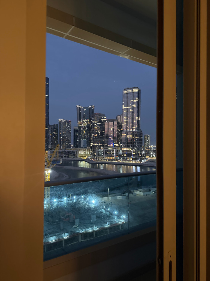 This image captures an elevated nighttime cityscape view through an open balcony or window, facing Al Reem Island in Abu Dhabi, United Arab Emirates. The scene is framed vertically by a beige-colored…read more