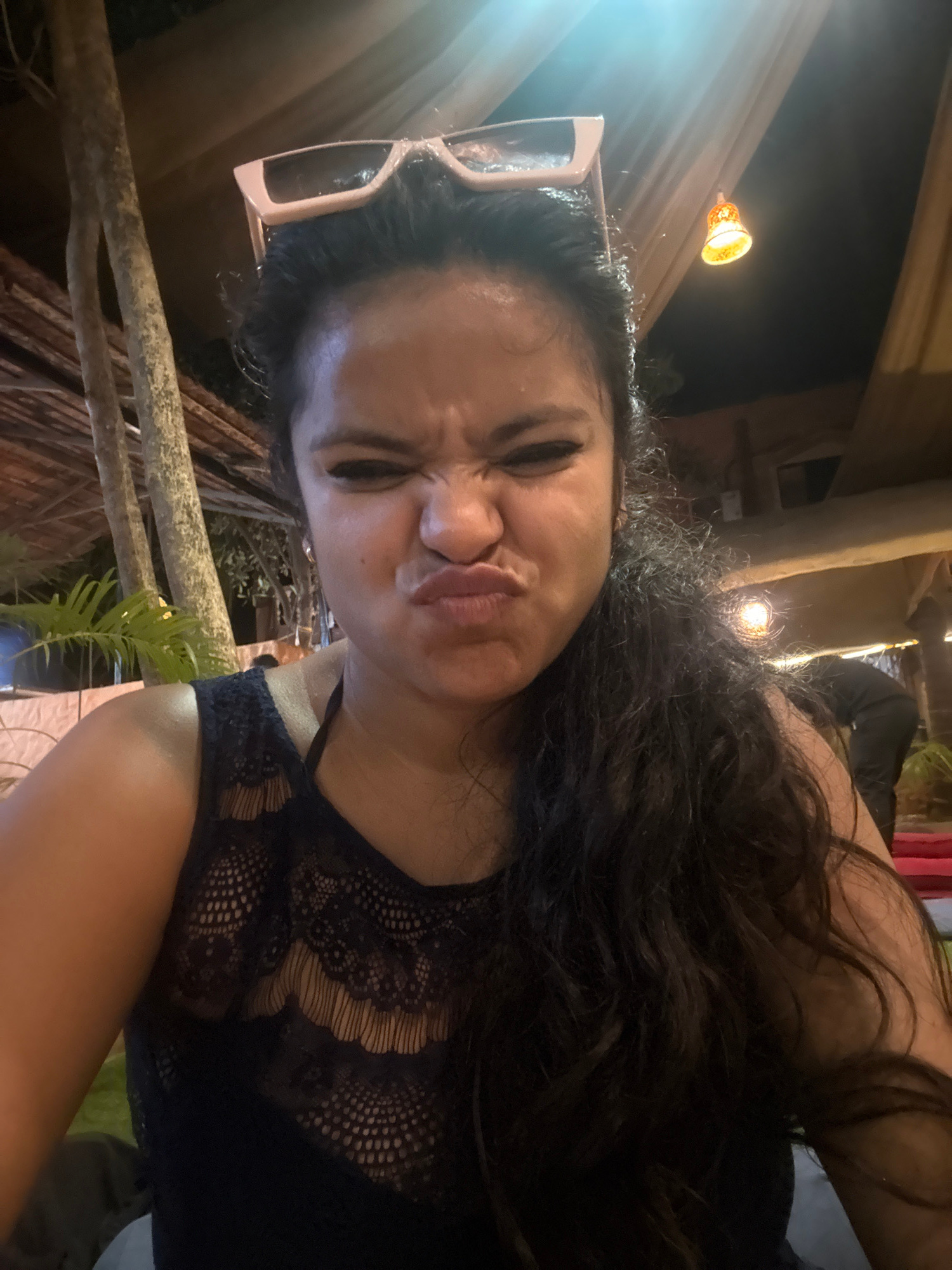 The image shows a woman with long dark hair and sunglasses perched on her head. She is wearing a black lace top and making a puckered-lip face. The background suggests an outdoor setting, possibly a r…read more