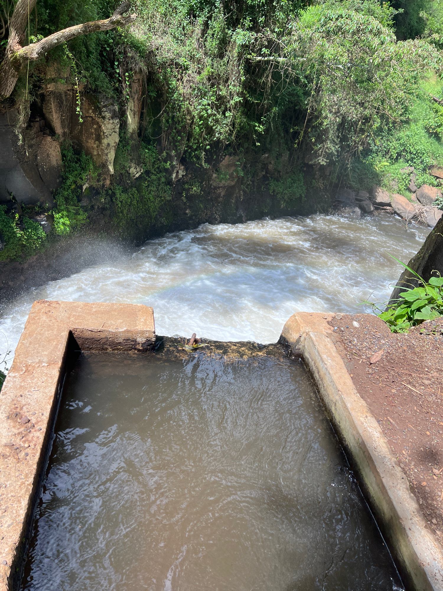 The image captures a high-angle view of Chania Falls, located near Nyeri, Kenya. Water cascades over a cliff face amidst lush green vegetation. A partial rainbow is visible in the waterfall's spray. T…read more