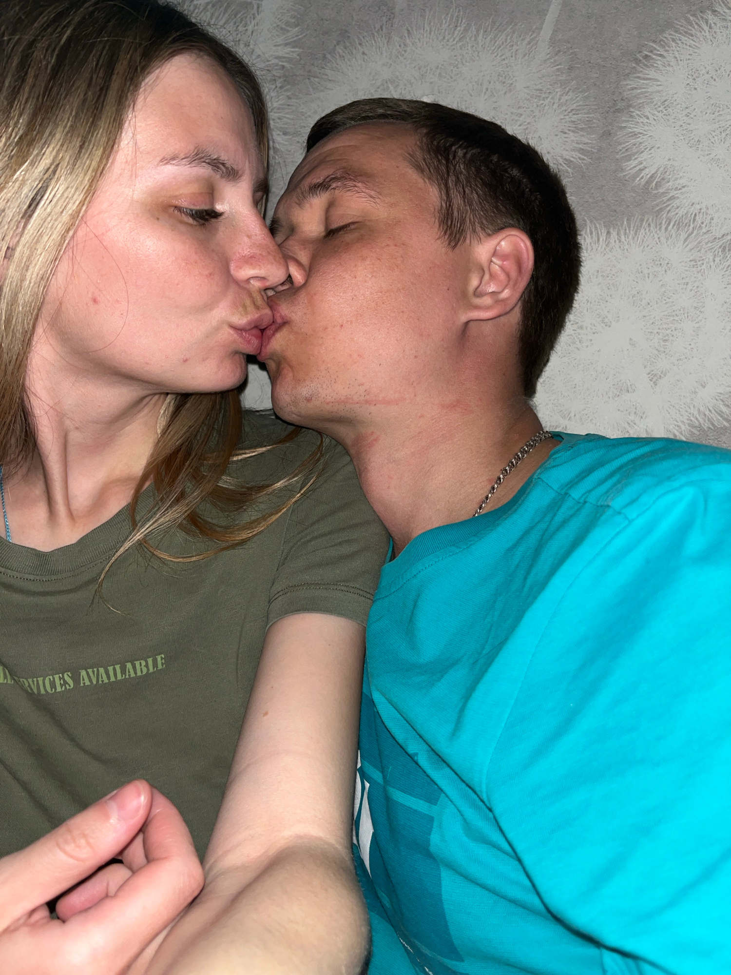 A man and a woman are kissing. The man is wearing a blue t-shirt and a silver chain. The woman is wearing a green t-shirt. The background is a gray and white patterned wall. There is not enough informβ¦read more