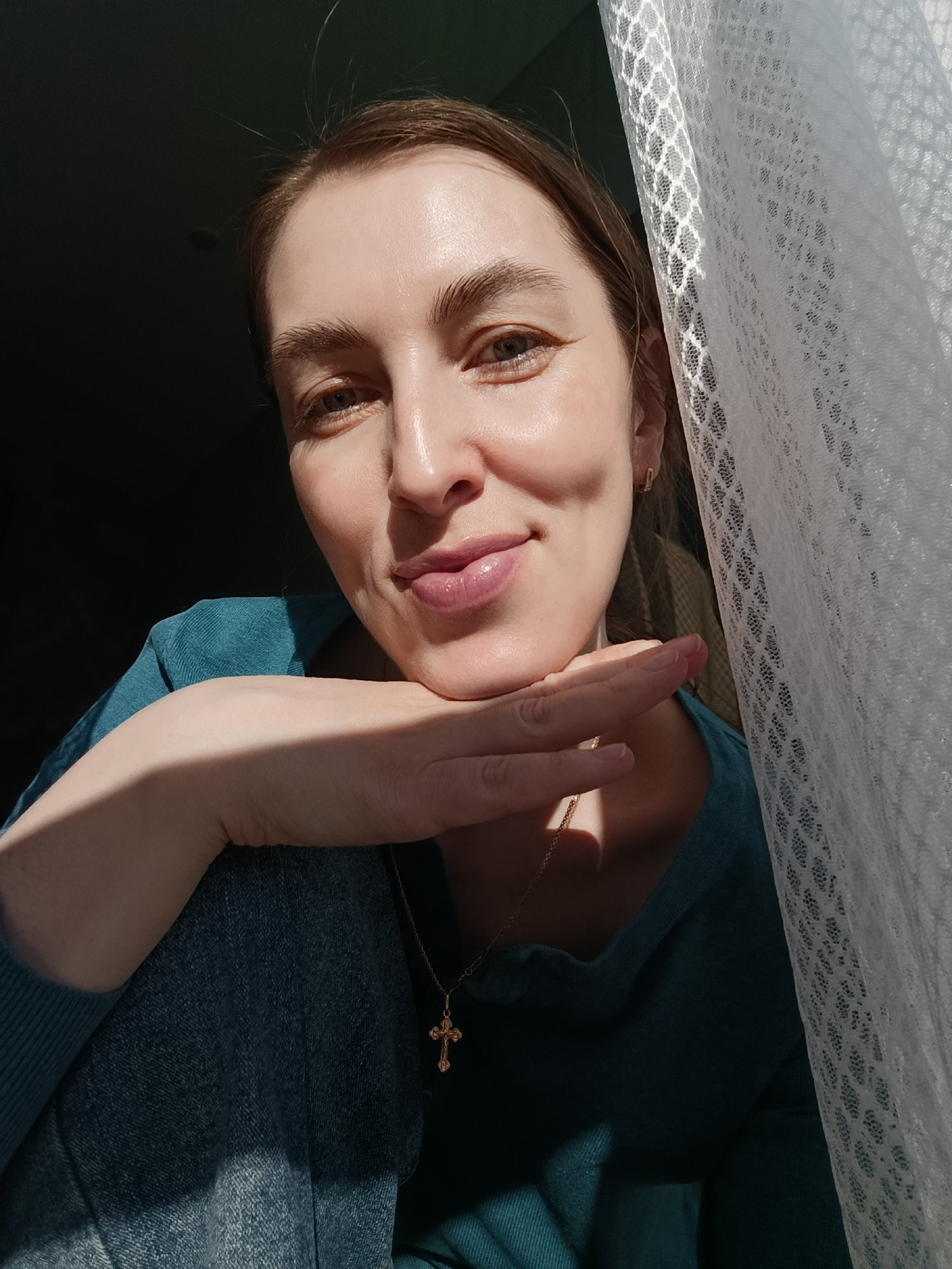 A woman poses in front of a window with a white lace curtain. She is wearing a teal shirt and denim jeans. A gold necklace with a cross pendant is visible. Sunlight illuminates her face and the curtai…read more
