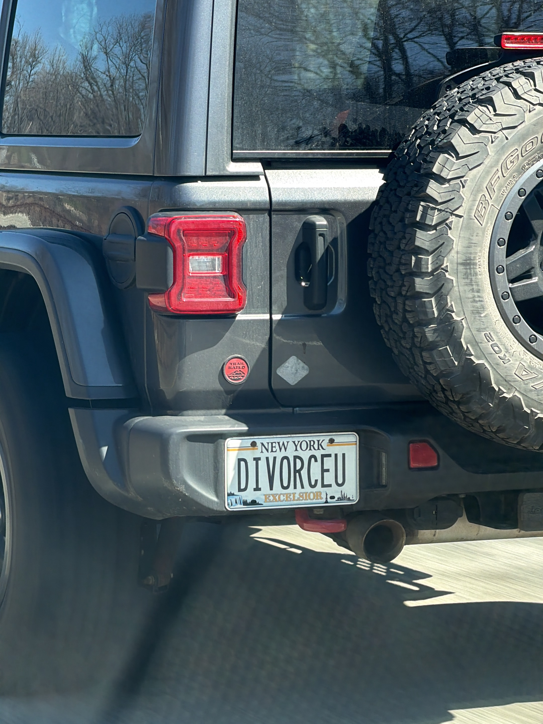 The image shows the rear of a gray Jeep Wrangler. The vehicle has a New York license plate that reads "DIVORCEU." A spare tire is mounted on the back door, obscuring part of the vehicle. A red taillig…read more