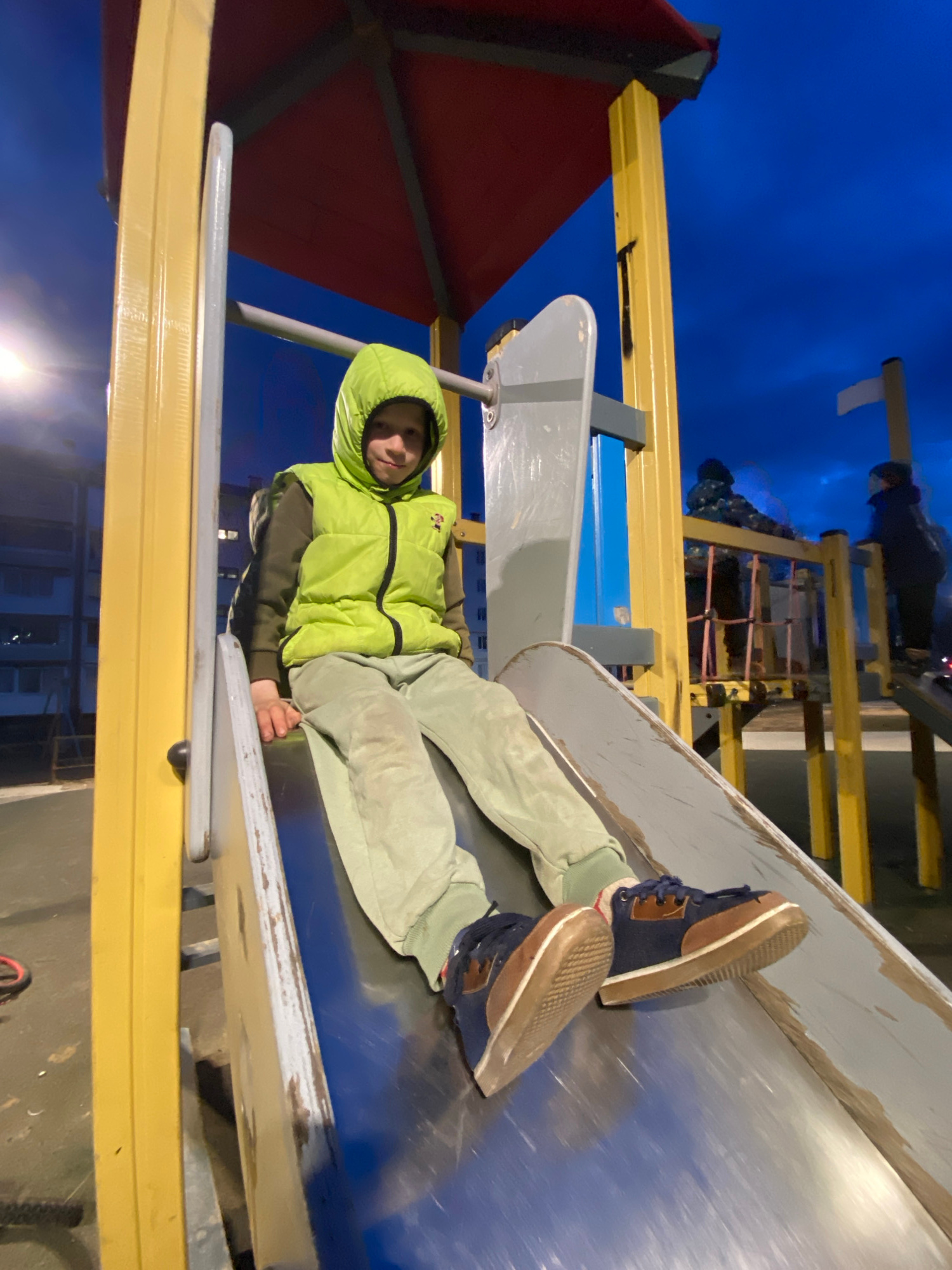 A child wearing a neon green hooded vest and light green pants is lying on a metal slide within a brightly colored playground structure. The child is facing the camera with a slight smile. The playgro…read more