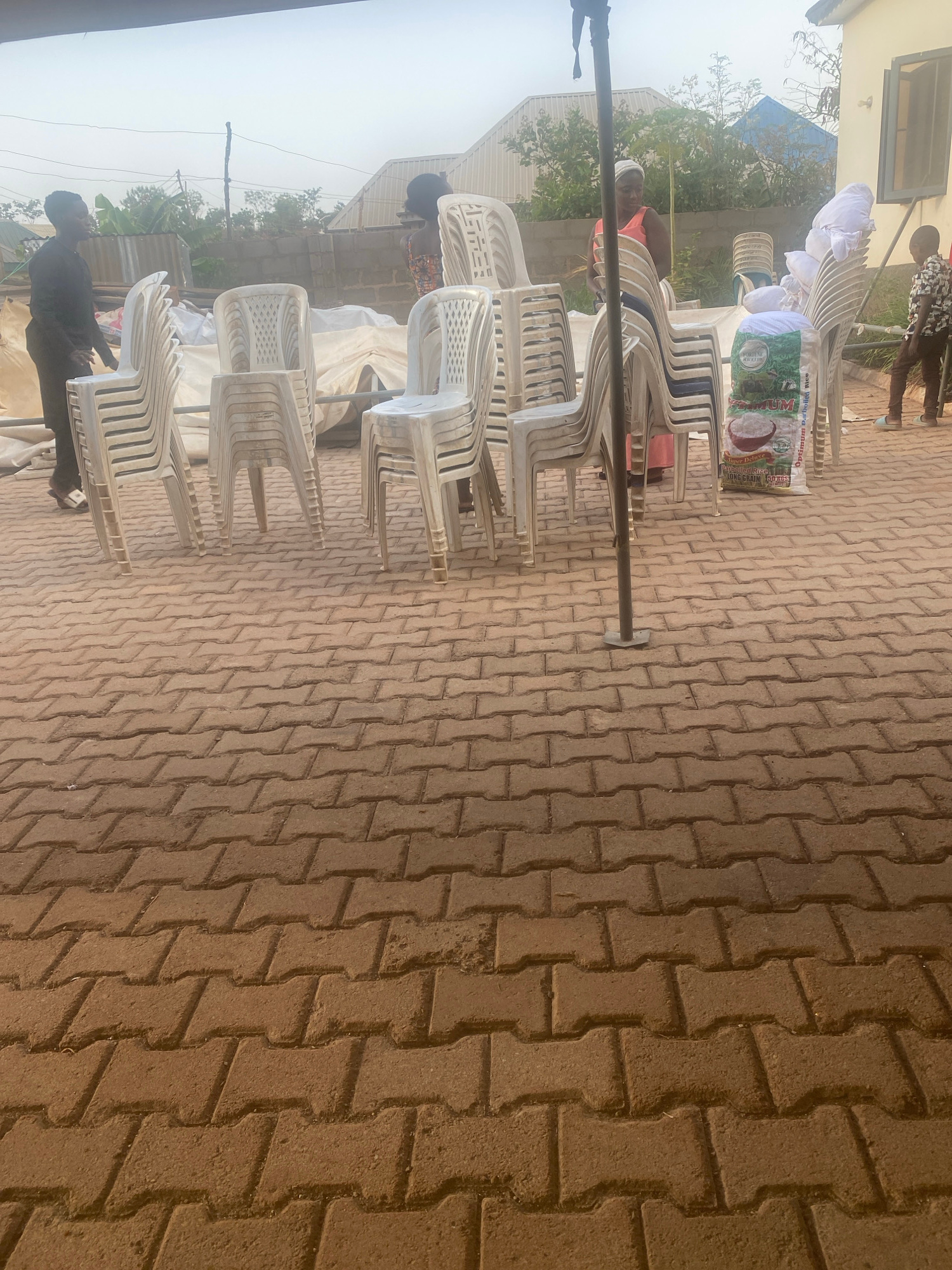 Scene in Sabon Tasha, Nigeria. Rows of stacked white plastic chairs on interlocking brick pavement. A bag of Optimum Parboiled Rice sits on the chairs. People are partially visible around the chairs.…read more