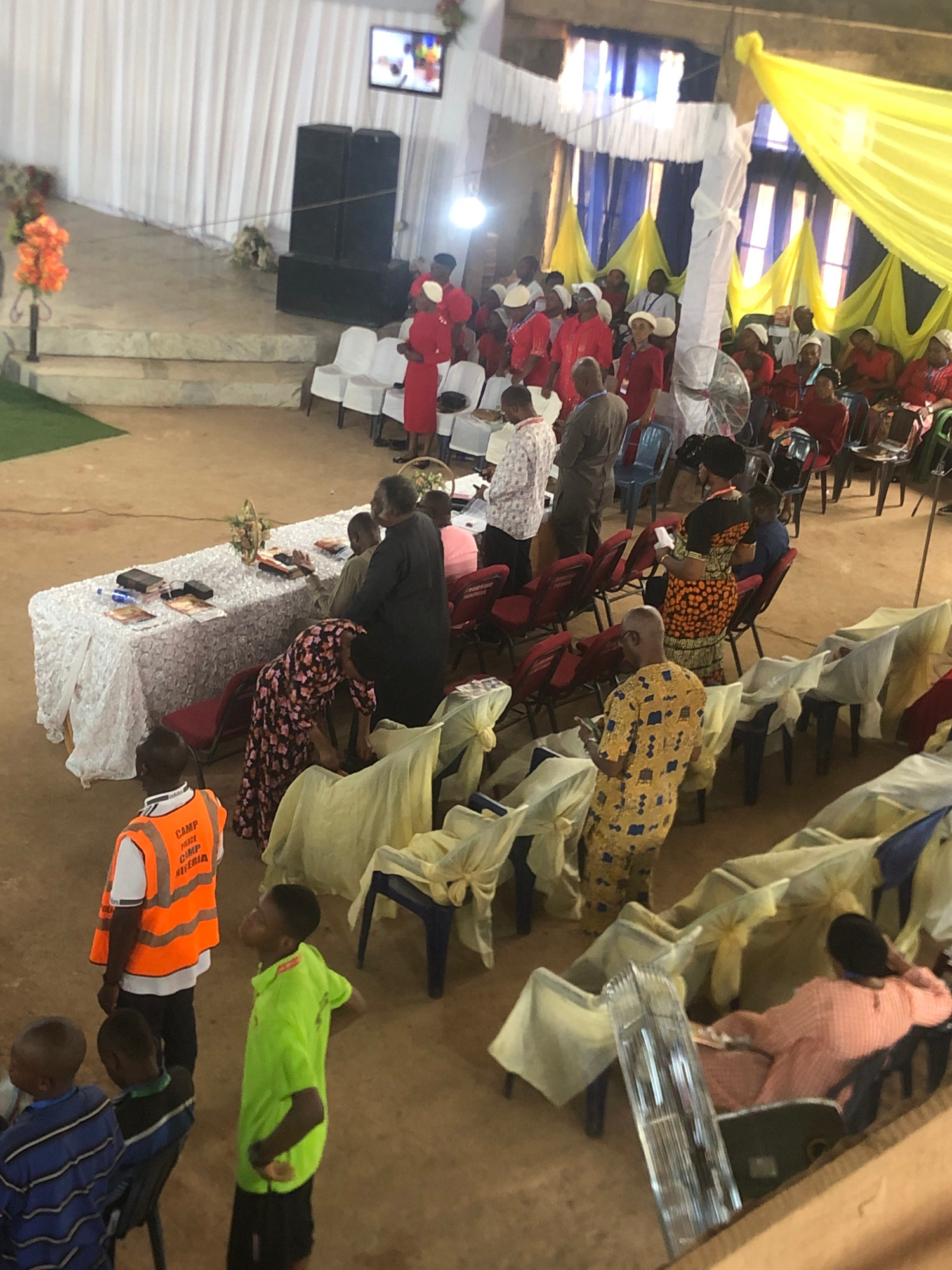 An indoor scene is captured from an elevated angle, featuring a gathering of individuals, likely in a religious setting in Obosi, Nigeria. The majority of attendees are seated on an assortment of chai…read more