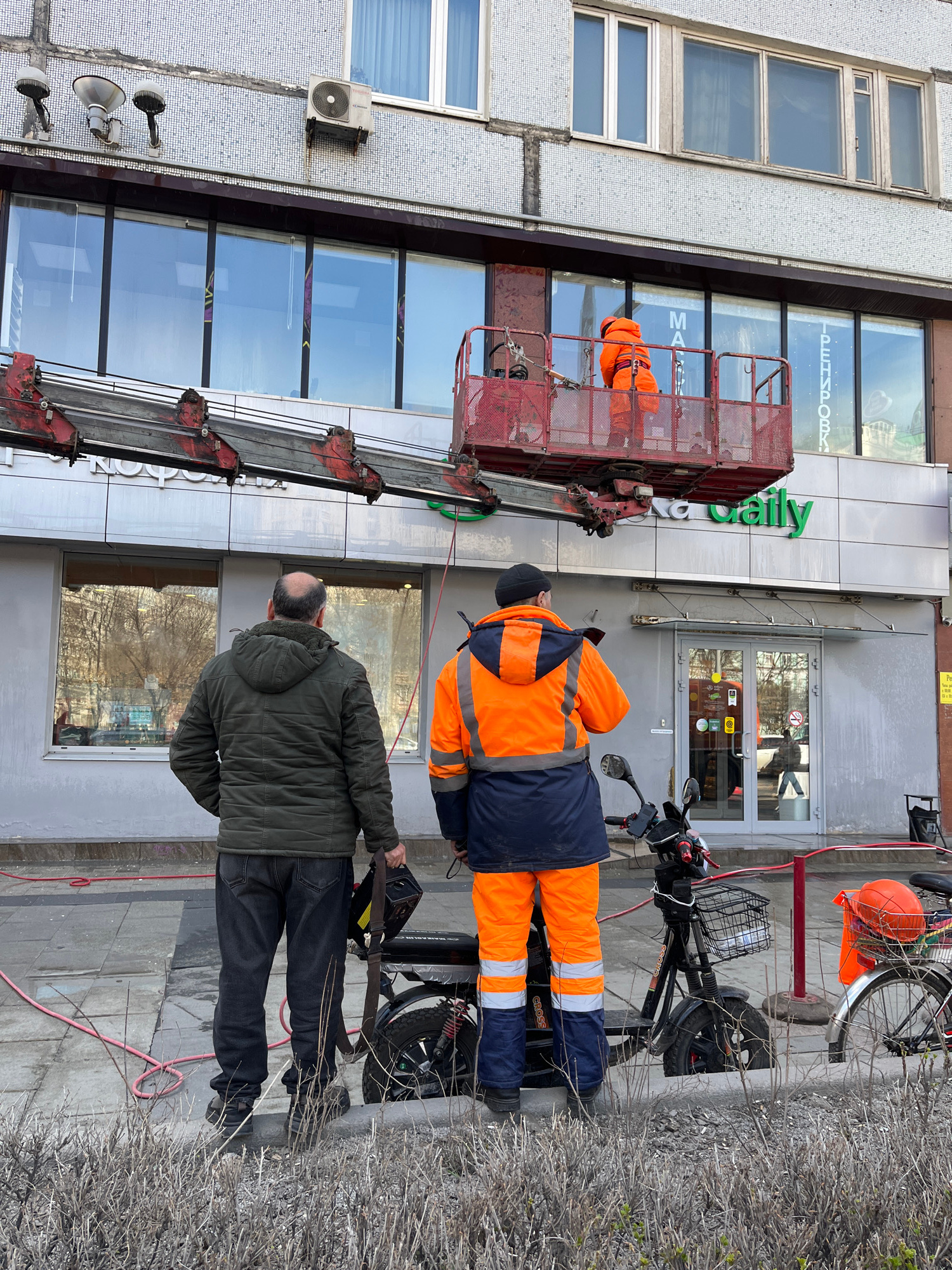 The photograph shows a street scene in Moscow, Russia. Two men are working on the facade of a building, presumably making repairs or installing signage. One man is positioned in a red lift platform, wearing an orange and blue work suit, indicative of high-visibility safety apparel. The second man, dressed in a green hooded jacket and black pants, stands on the sidewalk, appearing to observe or assist. The building has a gray facade with tiled or mosaic-like patterns, and large windows reflecting the sky. A green sign with the word "Caily" is visible above the entrance. A bicycle is parked nearby, with an orange helmet placed in its front basket. Various details, like the type of clothing and the design of the buildings, suggest that the location is in Moscow, Russia. The presence of a red hose on the sidewalk implies that the men are using water or some other liquid for their work. | Open Wire