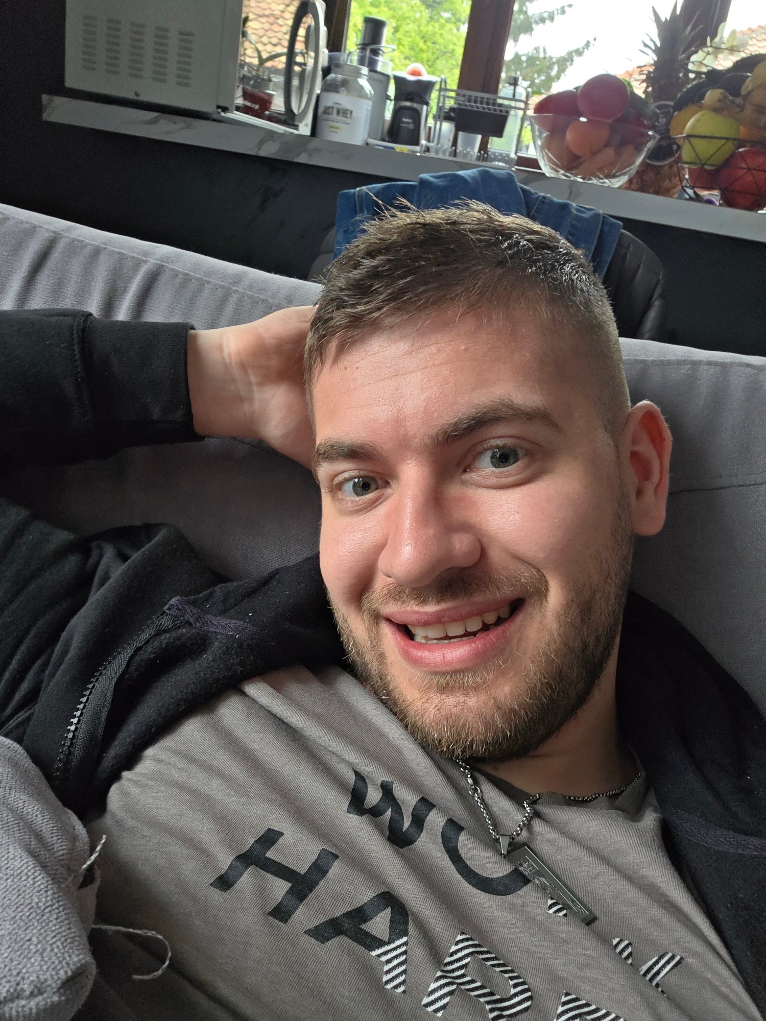 A man lies on a grey sofa wearing a grey t-shirt with black stripes and a black zippered hoodie. He has short brown hair, blue eyes, and a beard. He is smiling. A silver necklace with a rectangular pe…read more