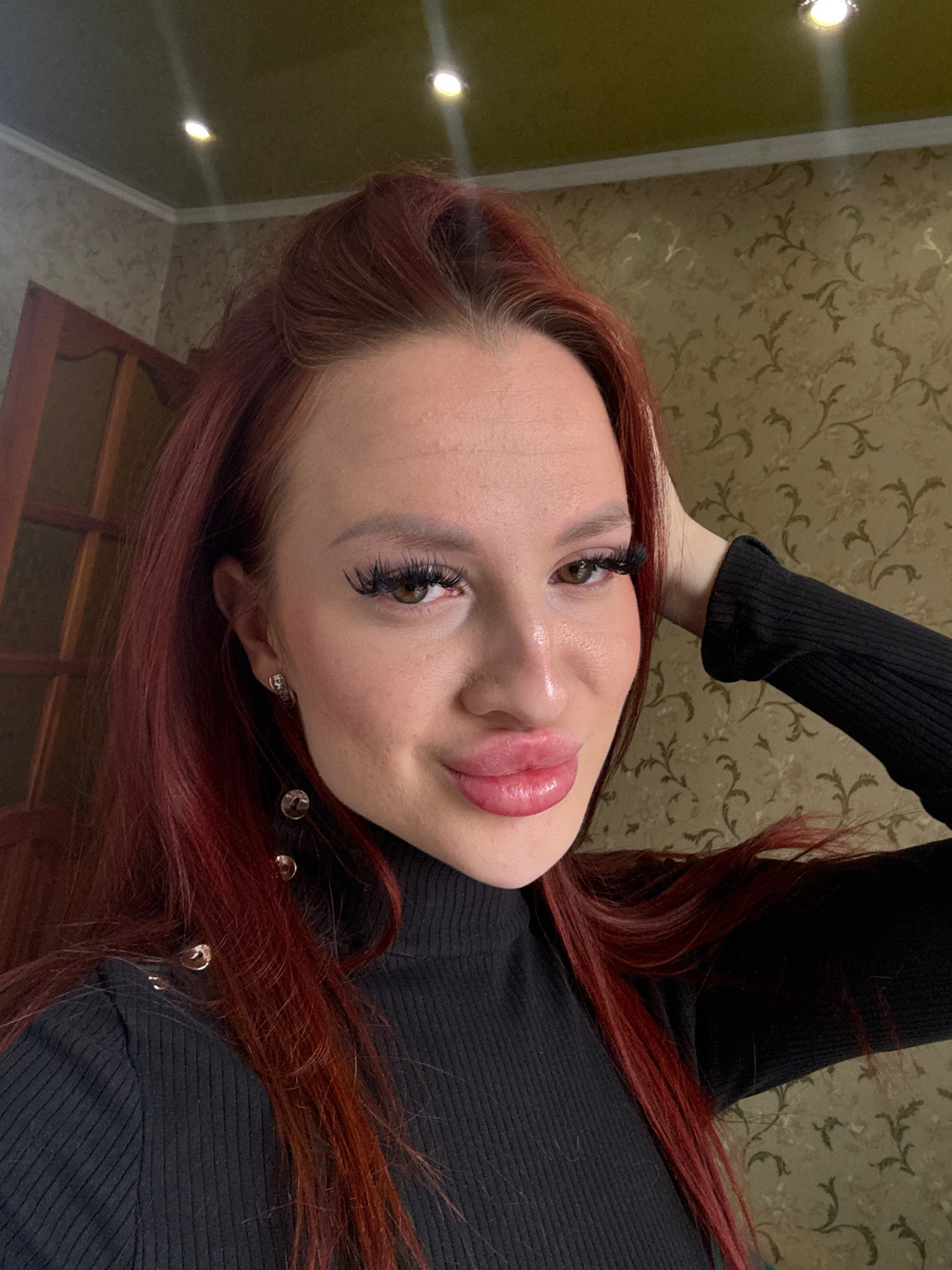 A close-up photograph of a woman with auburn hair. She is wearing a black, ribbed, long-sleeved top. Her hair is styled around her face. Her right hand is raised to her head. The background consists o…read more