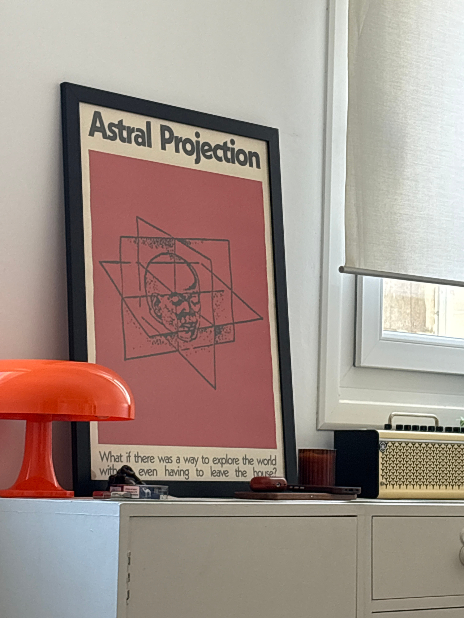 A framed poster hangs on a white wall. The poster has a black frame with the words "Astral Projection" in large font on the left side of the poster. To the right of the title, there is a stylized grapβ¦read more