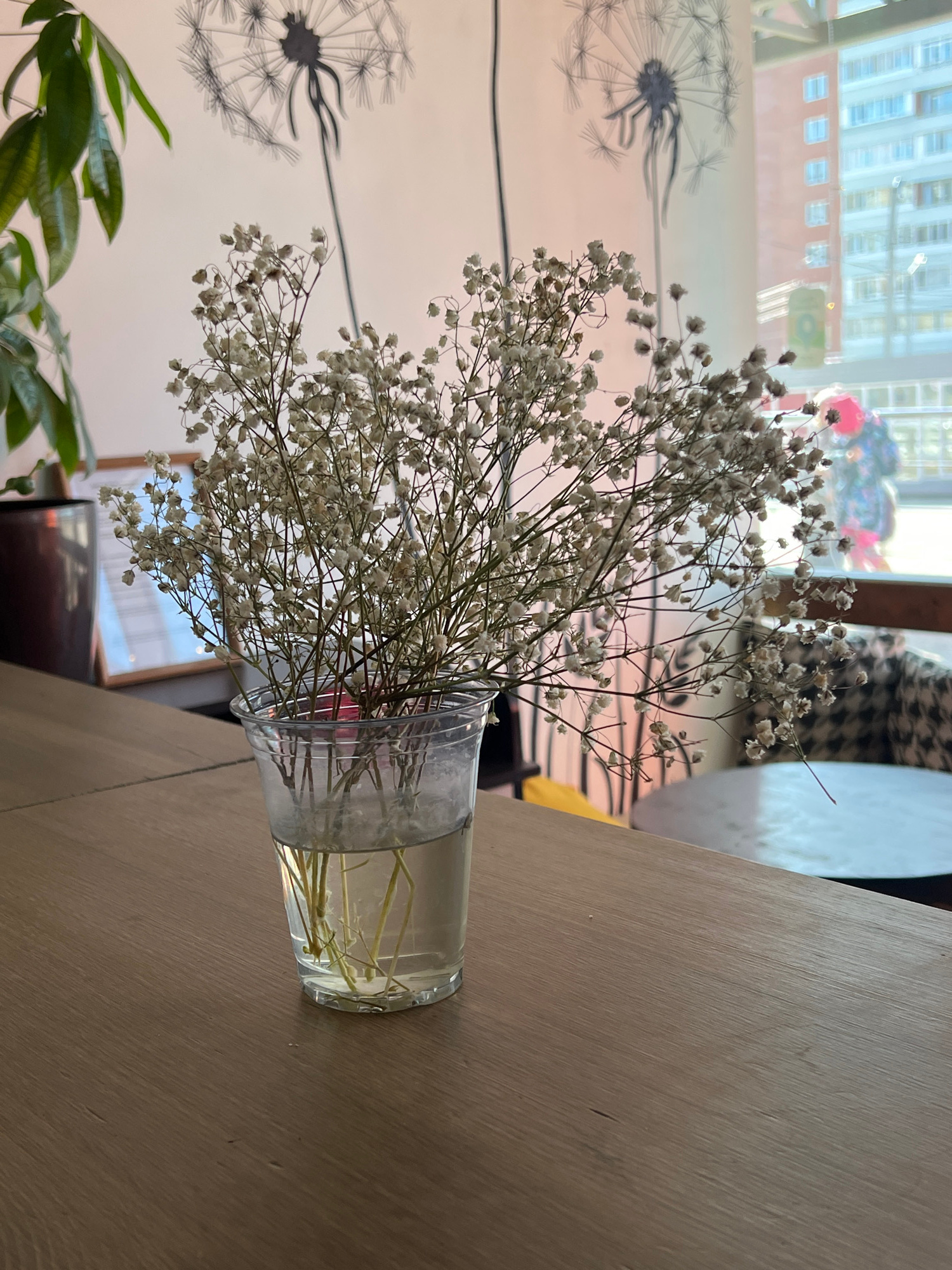 A vase of Baby's Breath flowers sits on a wooden table. In the background, a wall is visible with a dandelion mural. Through a window, city buildings are seen. While the prompt suggests the location i…read more