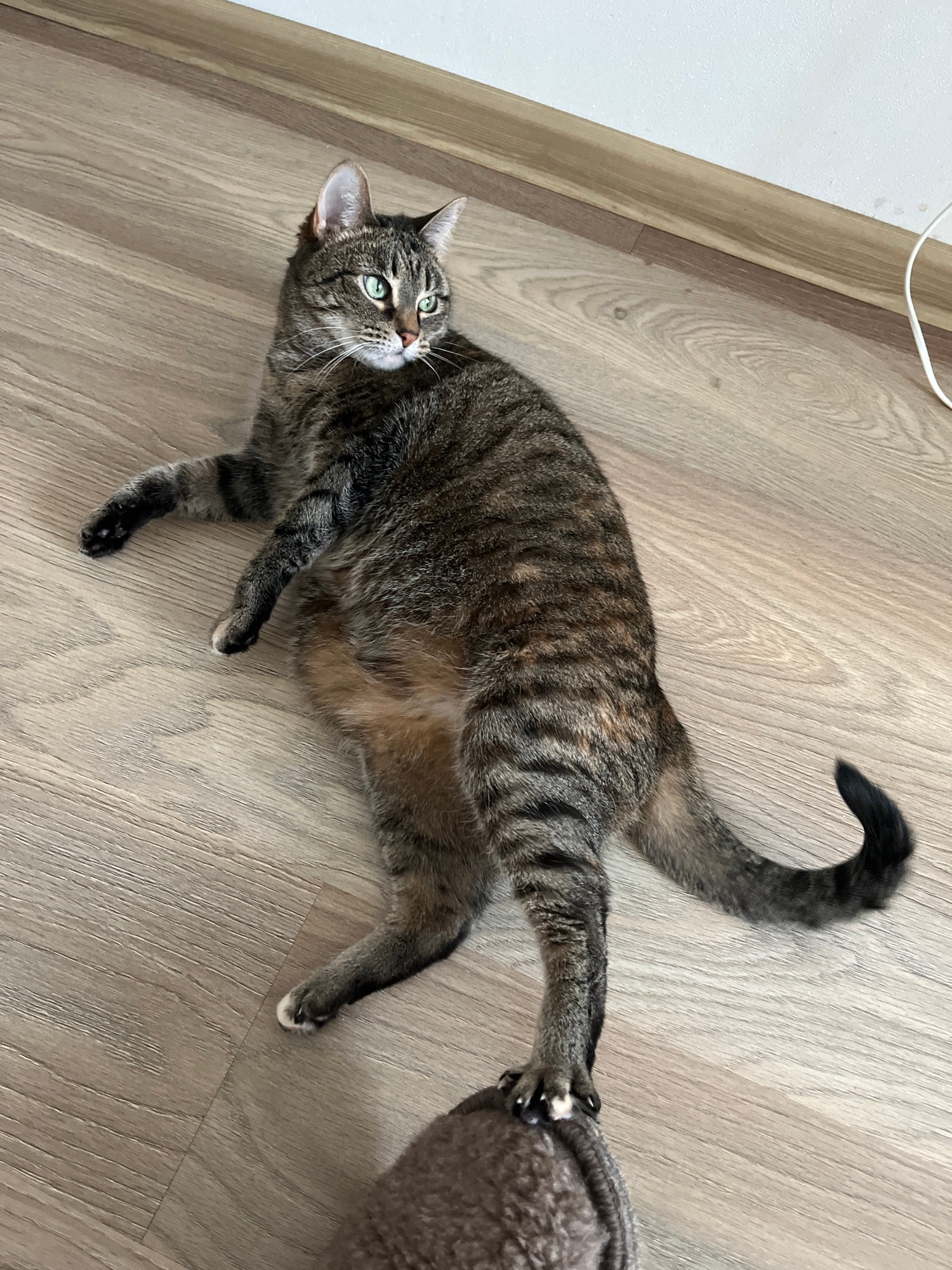 A tabby cat lies on its back on a wood-patterned floor. The cat's tail is curved upwards. One of the cat's legs is stretched towards a brown object, with its claws extended. A white wire is visible neβ¦read more